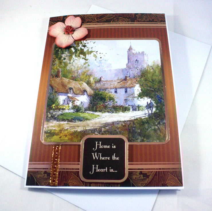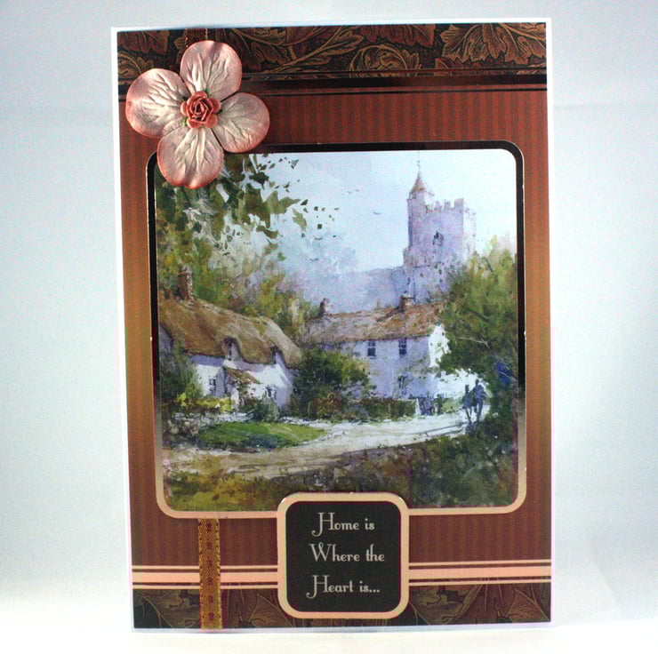 The image and sentiment 'Home is Where the Heart is...' are overlaid onto a coordinating copper coloured background, edged with autumnal leaves.
