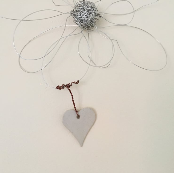 I have attached a white ceramic love heart which is also made by hand. This flower is 3D and will stand out from your wall. I have created a tiny hook on the back of the flower to hang it with.