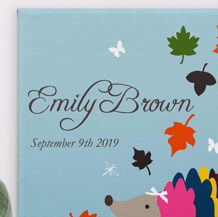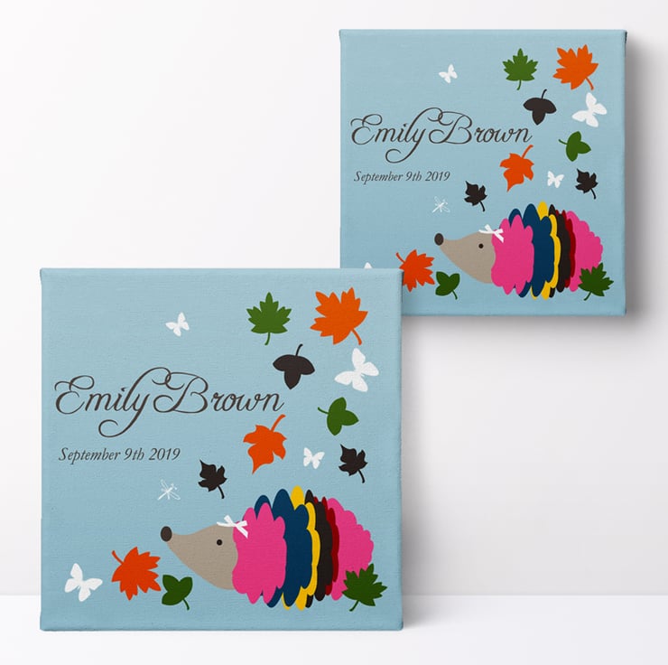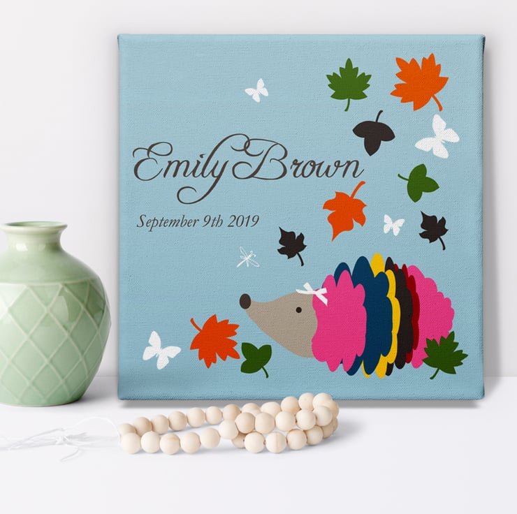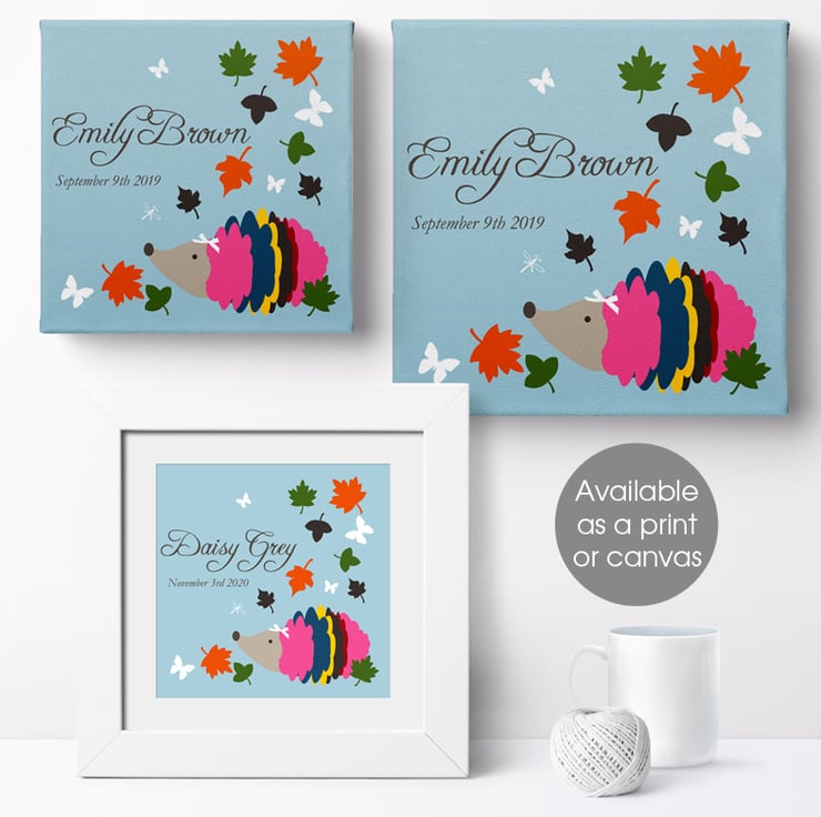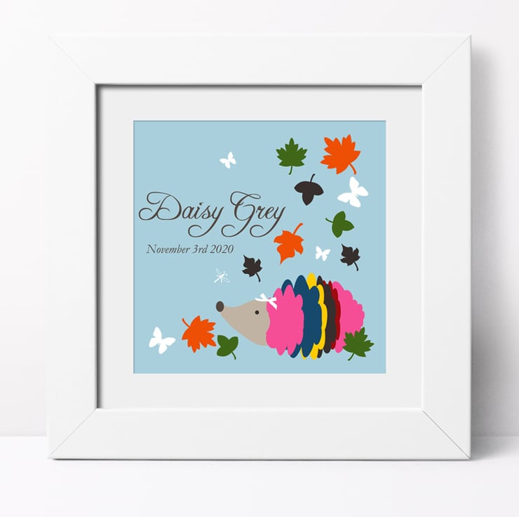 This adorable personalised Hedgehog print will look gorgeous on your little girl’s bedroom wall. Featuring your child’s name and date of birth in a beautiful cursive script, this will be a lovely finishing touch for their room. Perfect for a woodland or nature themed nursery or bedroom, this print will make a great gift for a birthday or christening too.