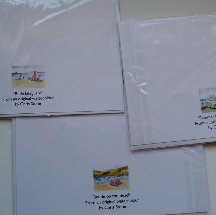 A pack of three greetings cards of different designs, professionally printed from my original watercolours. All have a seaside theme: Lifeguard on beach at Bude, VW Beetle at Polzeath beach, Cornwall and retro classic ice cream in a sea front location.