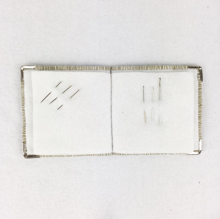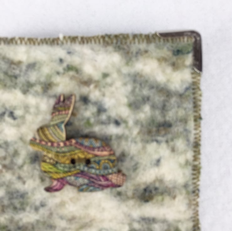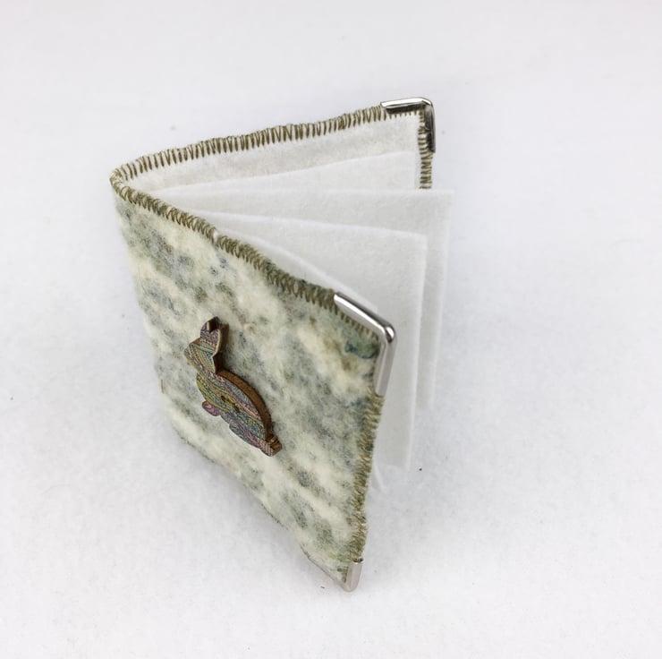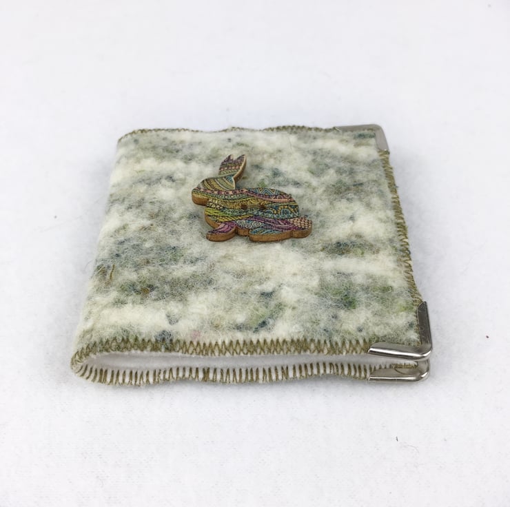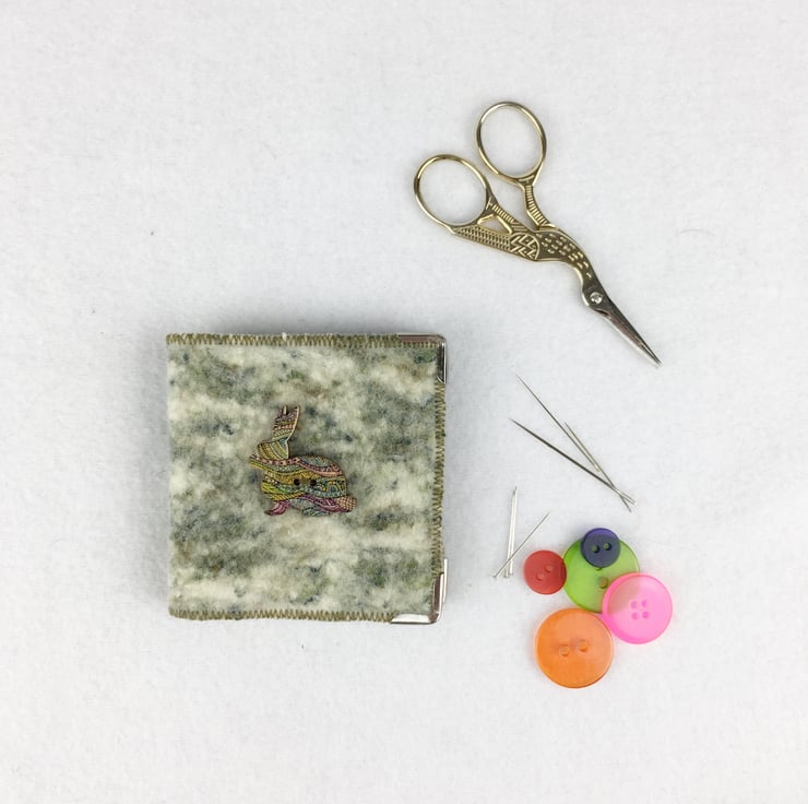 This sewing needle case has an outer cover of hand made felt in a green "tweed" wool and silk blend. Included in Seconds Sunday as an end of line item. The felted outer has been lined with a piece of white felt and sewn up into a needle case with 4 felt pages to keep all your needles and pins stored safely. Silver coloured corner protectors have been added to increase durability and a sweet wooden bunny button added to the front. The needle book measures approximately 8cm x 8cm (3" x 3") when closed.