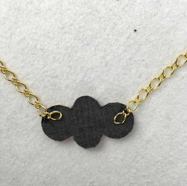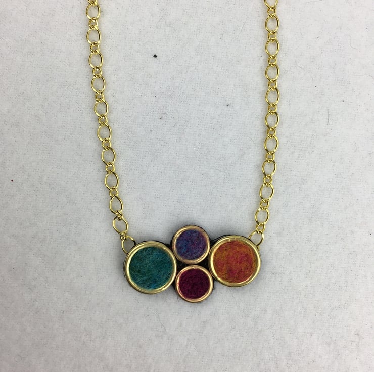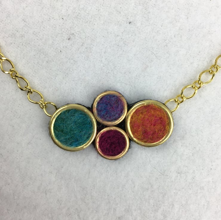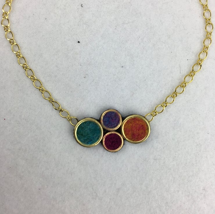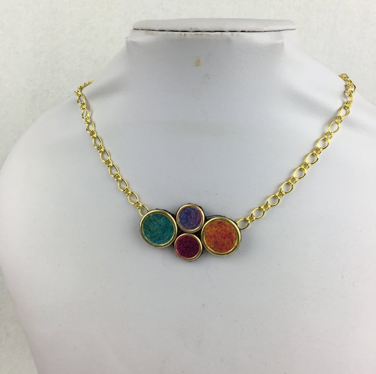 The decorative pendant part of this necklace has been made by mounting 4 brass coloured circles, in two different sizes, on a piece of felt and needle felting the centres with various brightly coloured woollen fibres. It has then been backed with a piece of dark grey fabric and attached to a gold coloured decorative chain. The central pendant measures approximately 5.75cm x 3.25cm (2.25" x 1.25") with the total length of the necklace measuring 45.75cm (18") although this can be made shorter or longer if required.