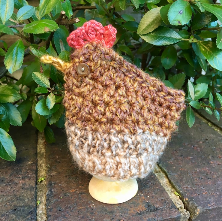 A pretty little brown chicken egg cosy which is crocheted, made using a lovely marbled yarn in shades of brown and beige and gold. I have sewn on two little brown buttons for eyes and there is a yellow beak and coral comb attached. Other colours are available in my shop (please see photos).