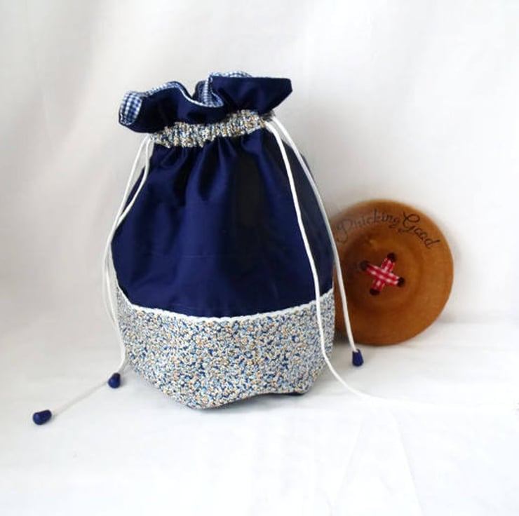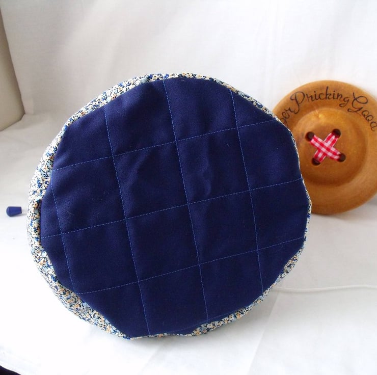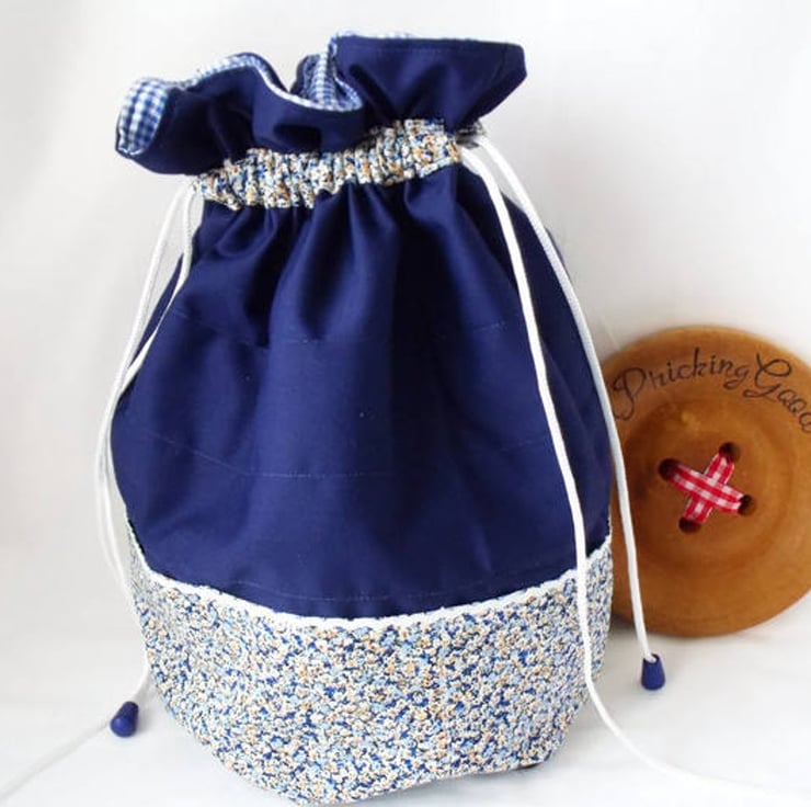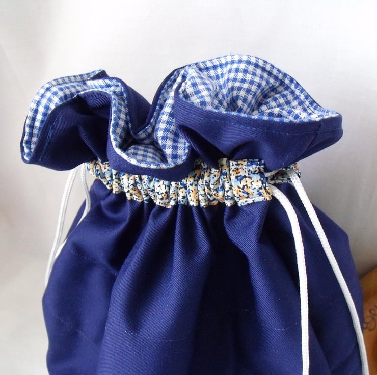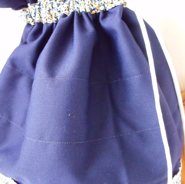 Sewn with plain navy cotton and floral navy and gold cotton fabric.