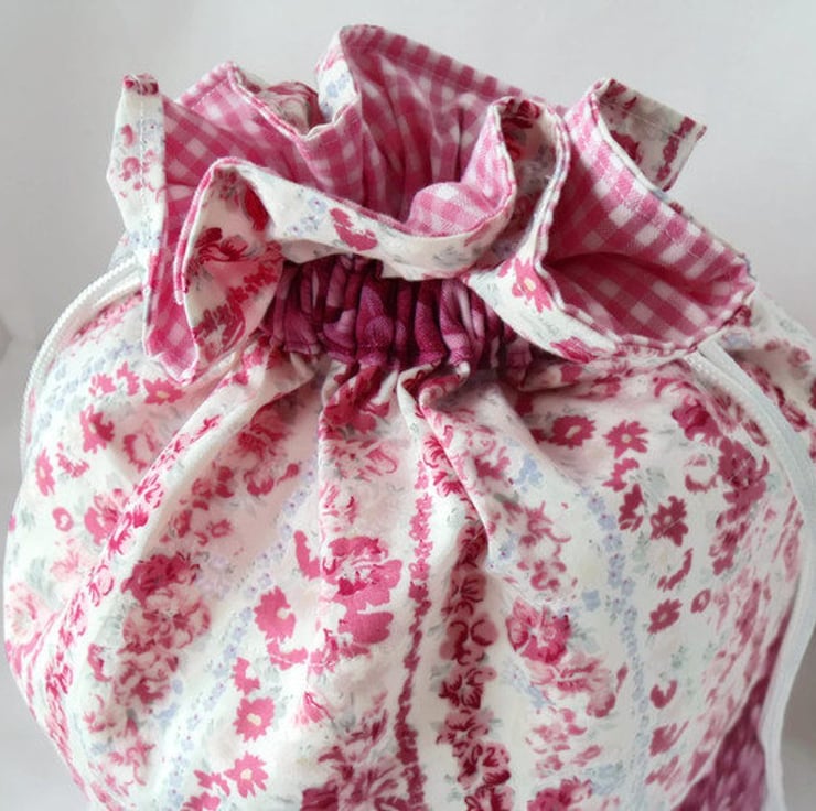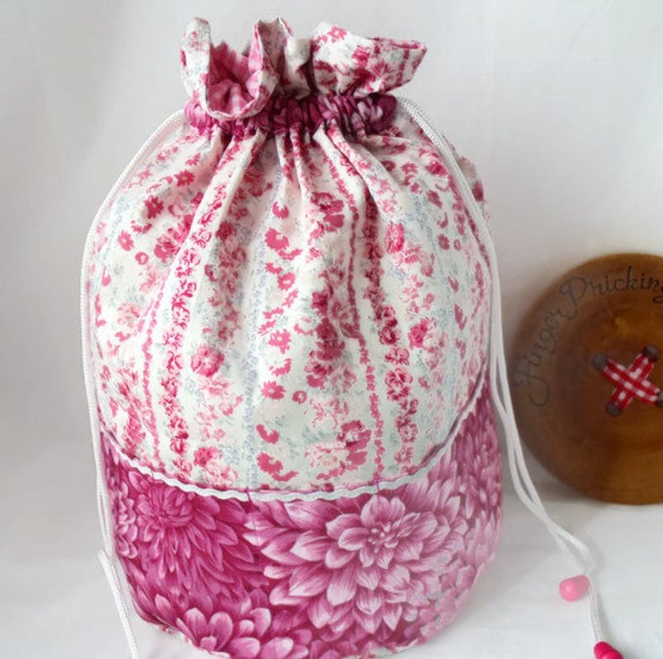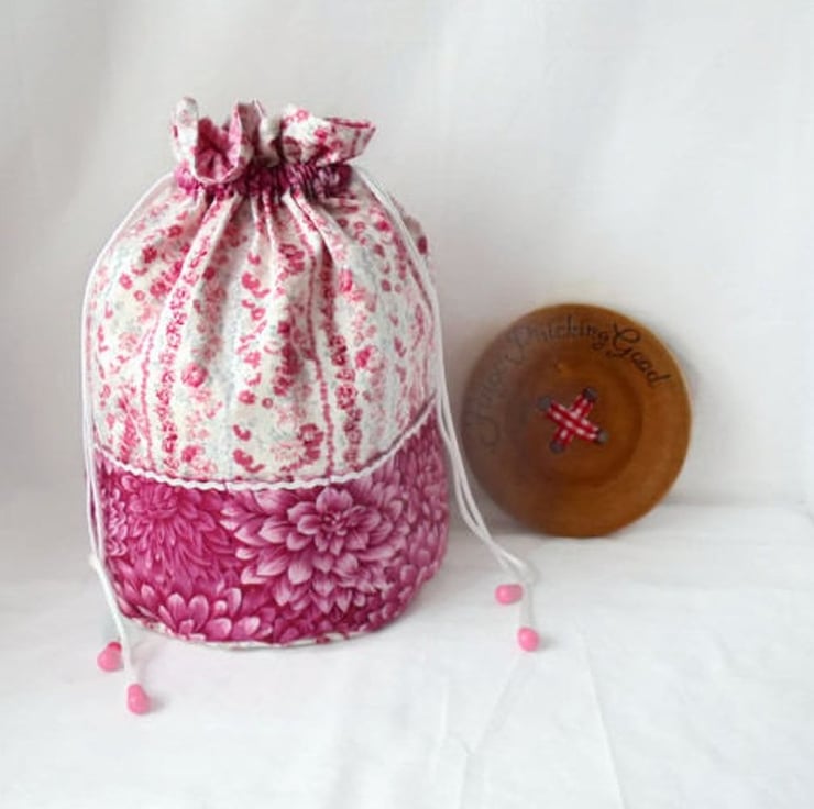 Drawstring crochet project bag with pockets or can be used as a toiletry/make up bag.