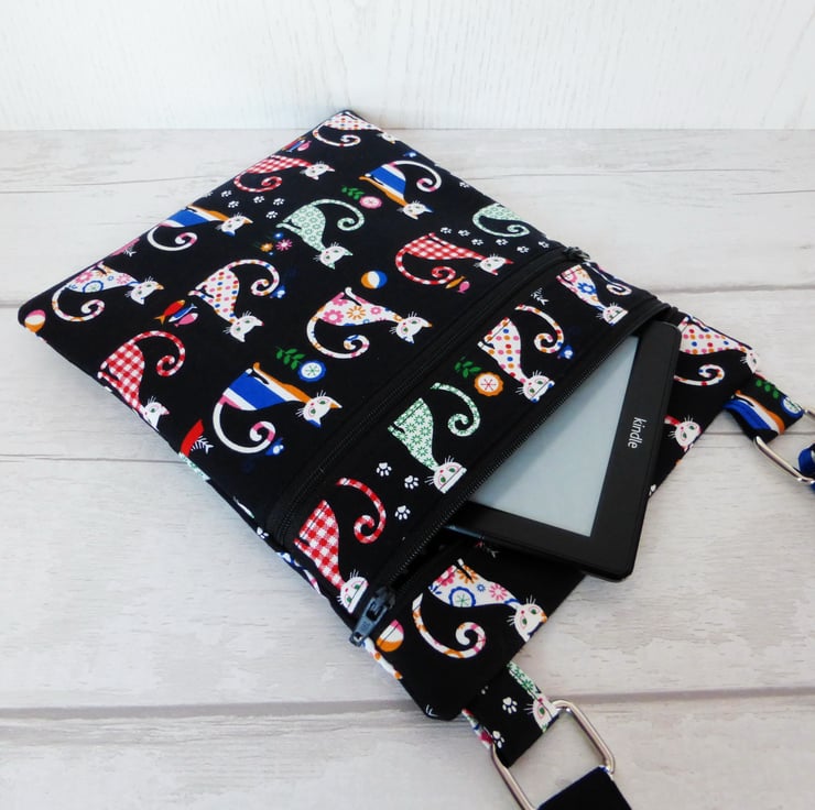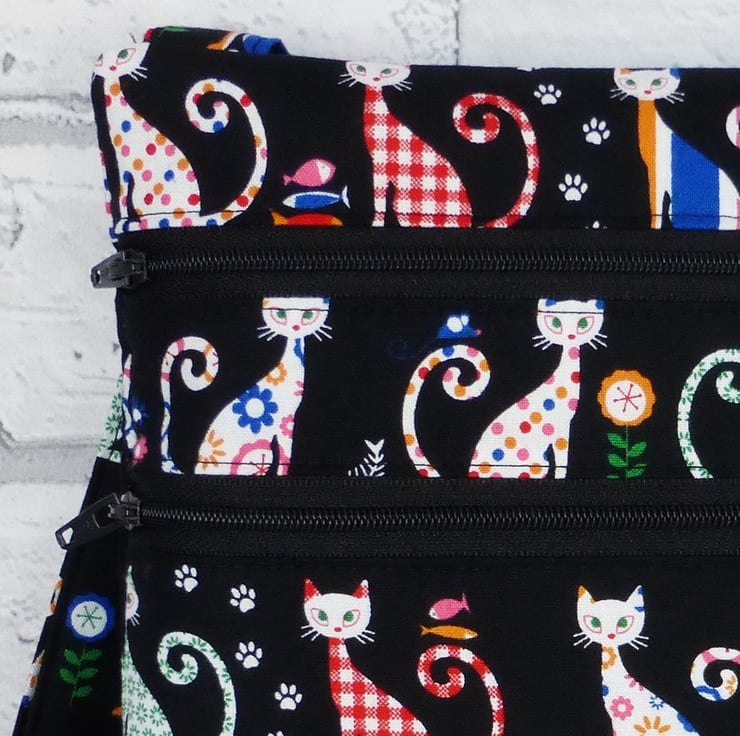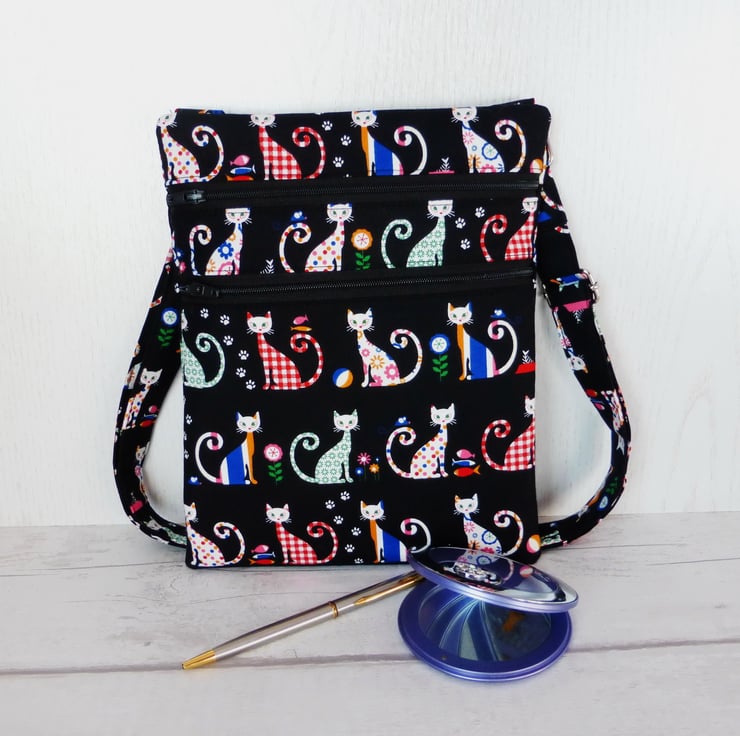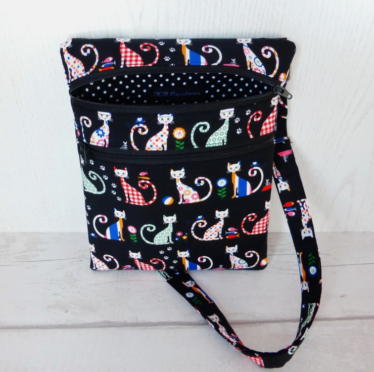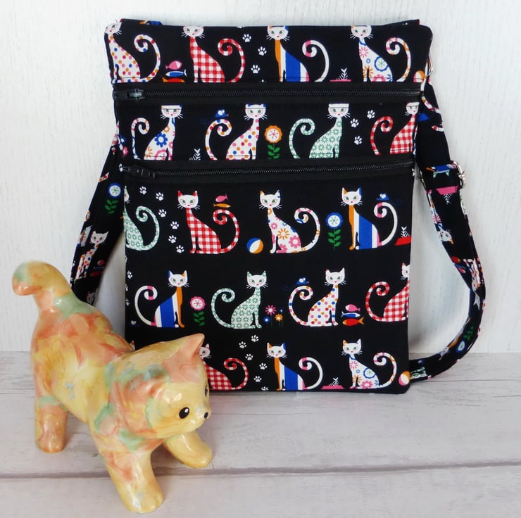 A great, practical cross body or shoulder bag made from 100% cotton fabric. The main fabric is lovely design of cats in various colours an a black background. A great bag for your essentials such as purse, keys phone etc.