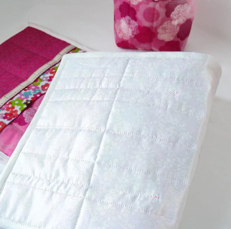 It is quilted using cotton wadding and lined at the back with white tone on tone cotton fabric.