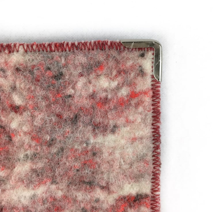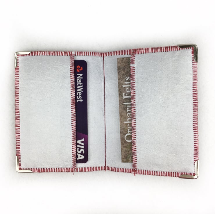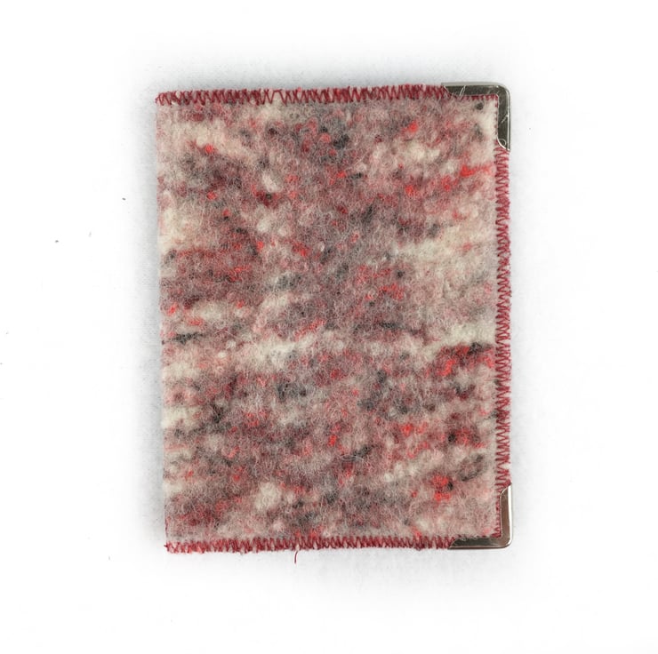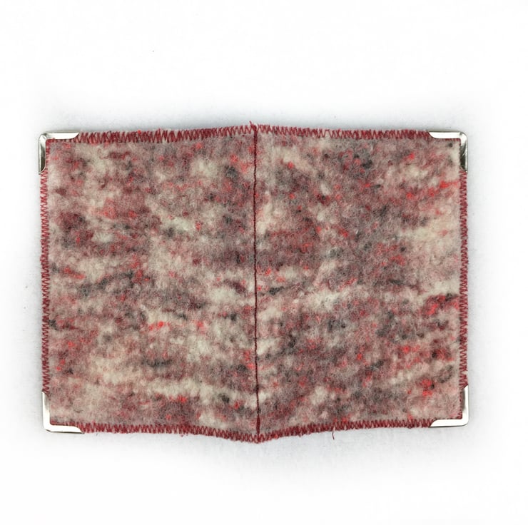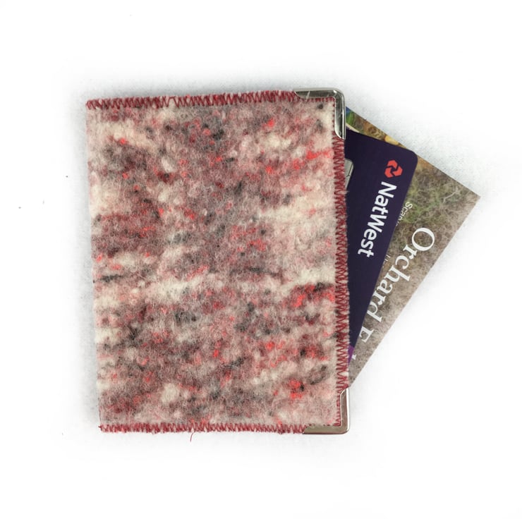 The outer cover of this card wallet has been hand felted using a red tweed blend of wool and silk. It has been designed to protect your bank cards from unauthorised contactless use by having an RFID layer sewn into it. The wallet is lined with white silk fabric with a layer of RFID fabric sandwiched between the outer and the lining. Two pockets, both also lined with RFID fabric, have been added to the inside. The RFID fabric prevents the card from being read whilst within the wallet.