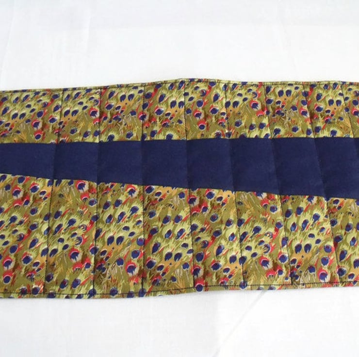 Sewn with peacock print cotton fabric in navy, rust red and khaki.