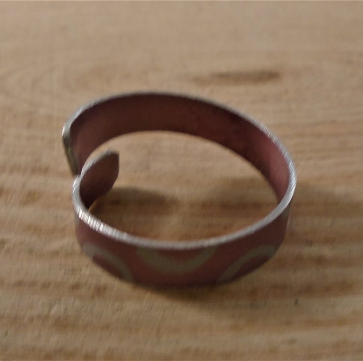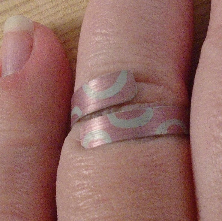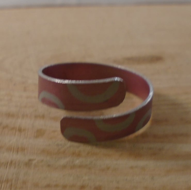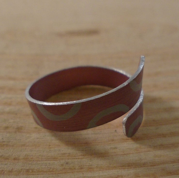 A simple, everyday ring, hand made from anodised aluminium. A 5mm wide strip of aluminium has been hand cut. It has then been drawn with semi-circle doughnut shapes, and dyed red. The strip has then been bent around a mandrel to form the cross over ring.
