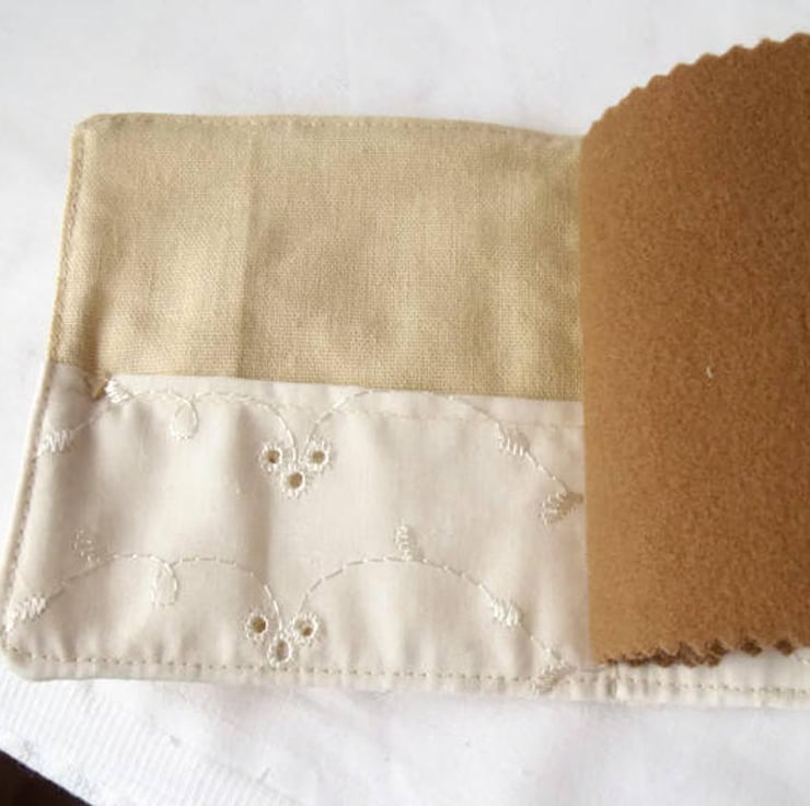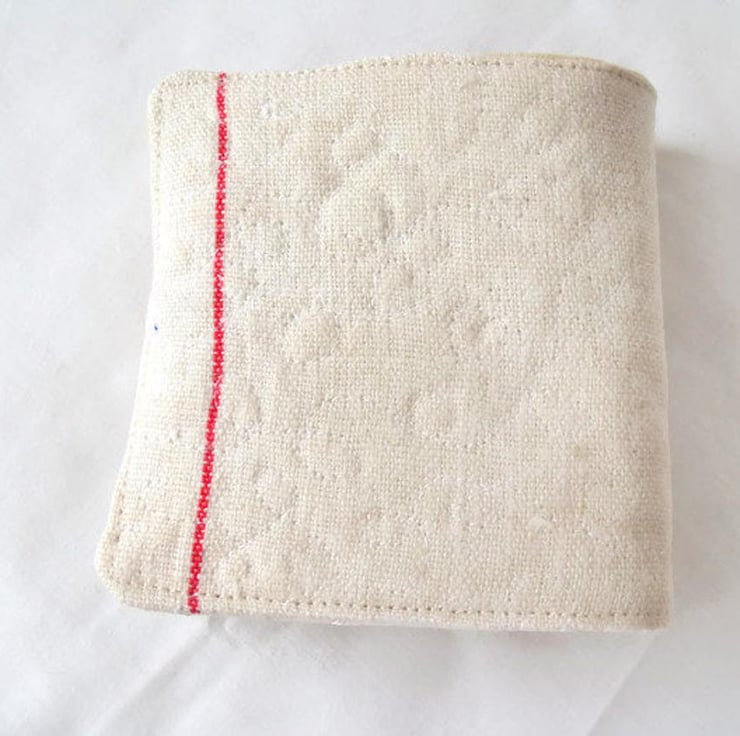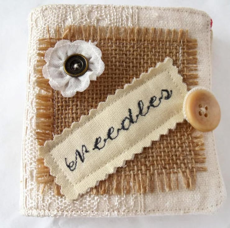 Sewn using a vintage unused linen tea towel, then I've hessian, a small flower, brass button and embroidered the words needles onto cotton fabric.