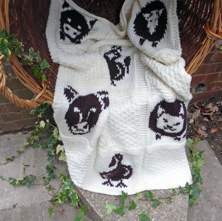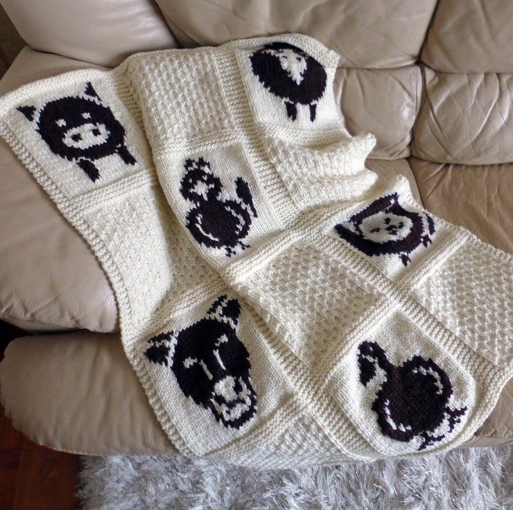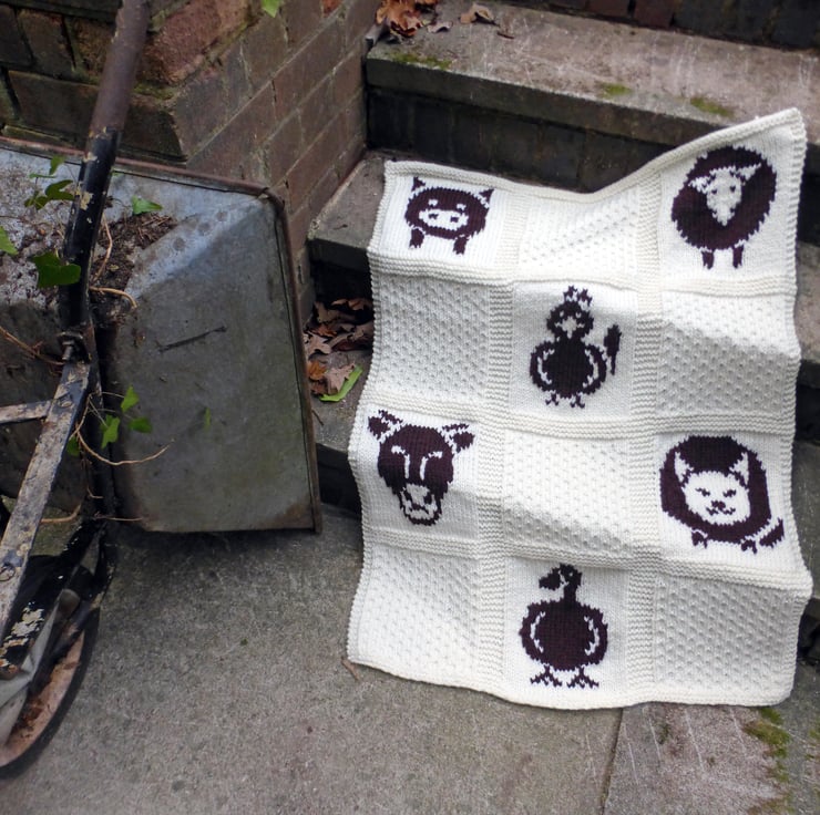 This listing is a KNITTING PATTERN for you to make the farmyard animal themed baby blanket pictured. The blanket is knit using garter stitch borders, with alternating blocks of a dot stitch textured pattern and stocking stitch with animal motifs added using the intarsia method. The pattern is written in English.