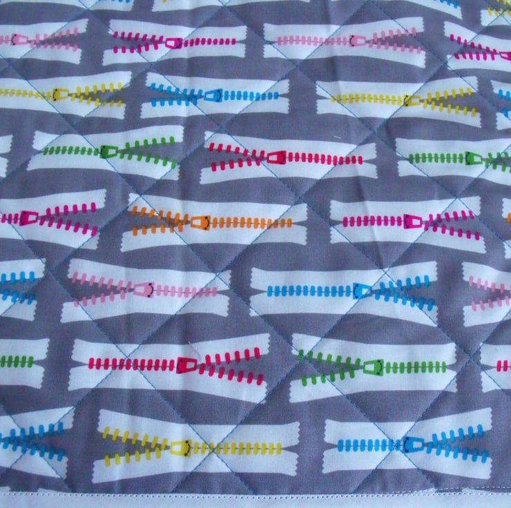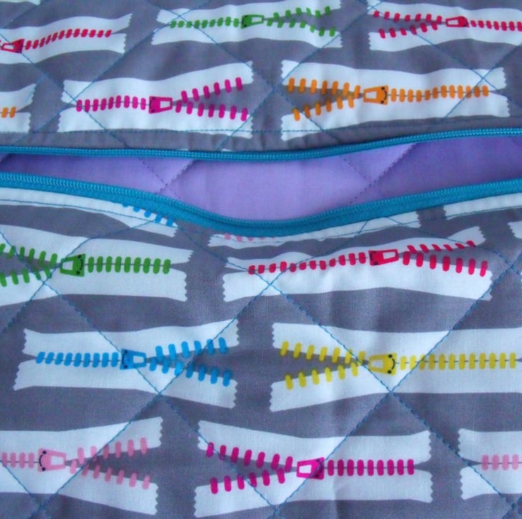 Turquoise zip with matching quilting stitches, the lining is lilac cotton fabric.