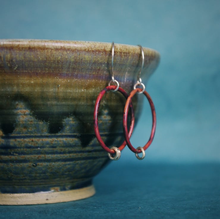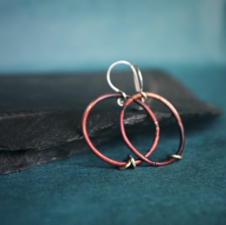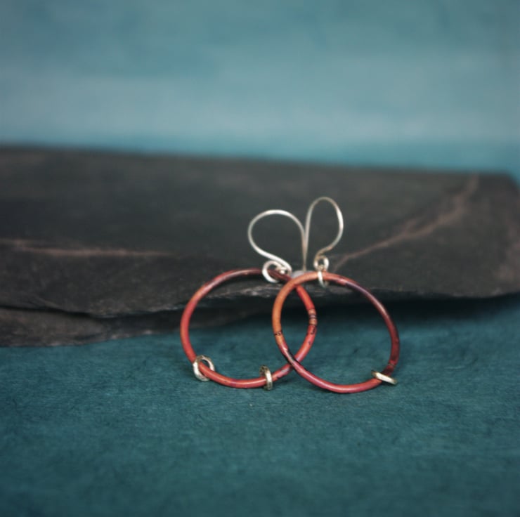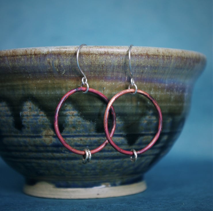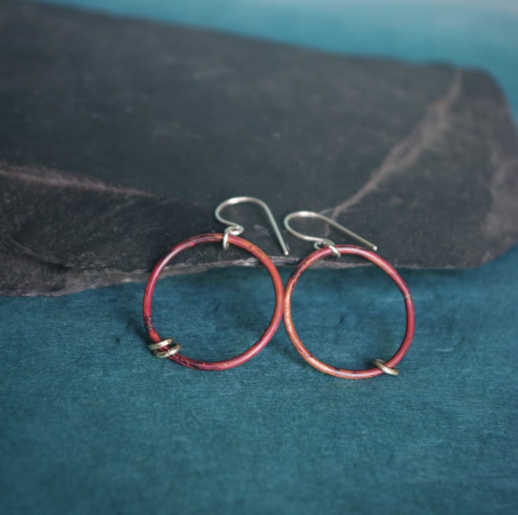 Copper hoops of diameter 28mm/ just over an inch- a bit larger than a 2p piece hang from sterling silver handmade ear hooks . The copper has gained deep red tones and small areas of black as a result of heat . There is a silver jump ring attaching the hoops to the earhook , to allow for movement of the copper hoop; so that it spins around.