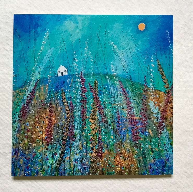 This card has been made from one of my original acrylic canvas paintings. It is a blank card so is suitable for a variety of occasions. It measures 14.5x14.5 cm and comes with an envelope and cello cover for protection.
