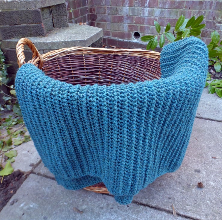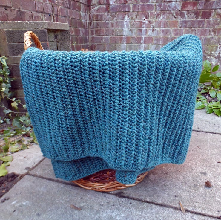 The blanket pictured was knitted on 6mm/US10 needles using Stylecraft Special Aran with Wool, which comes in 400g balls, and was designed to use only one ball. The sample blanket has not been blocked, steamed or stretched.