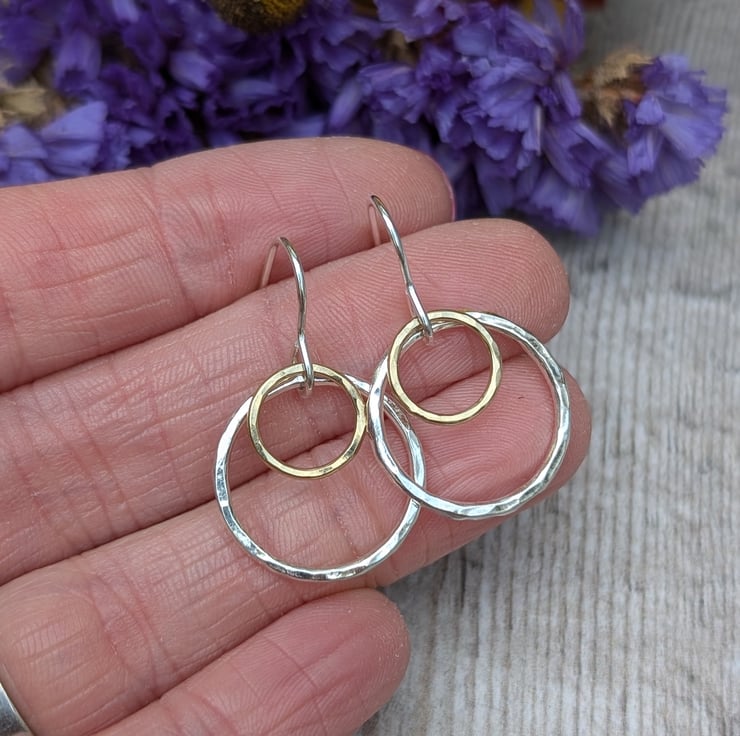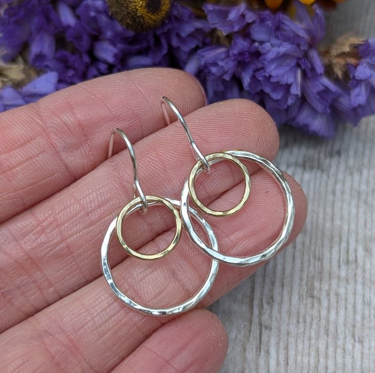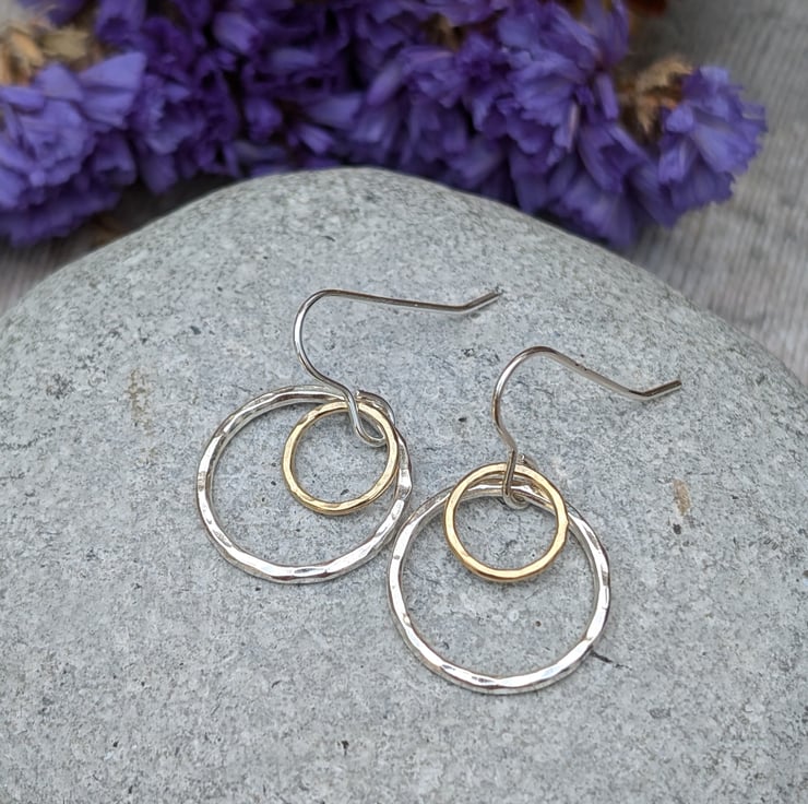 These handmade earrings feature two circles, one in recycled sterling silver with a softly hammered finish and the other in 9ct gold fill for a warm contrast. The mix of metals makes them a versatile choice, perfect for everyday wear or a thoughtful gift.