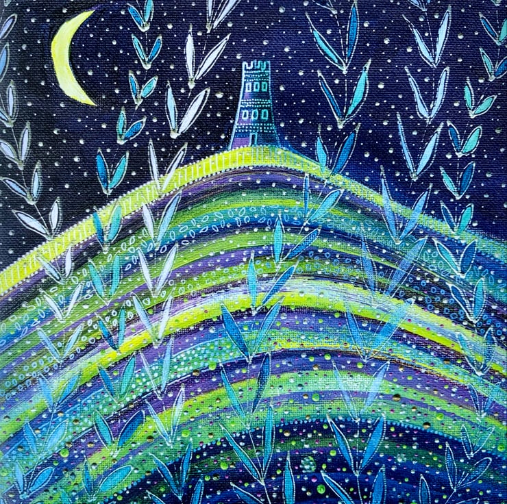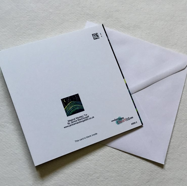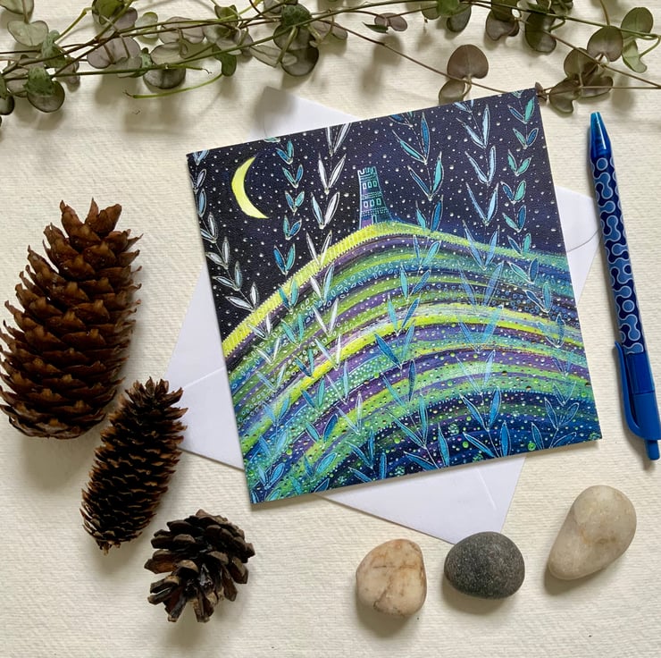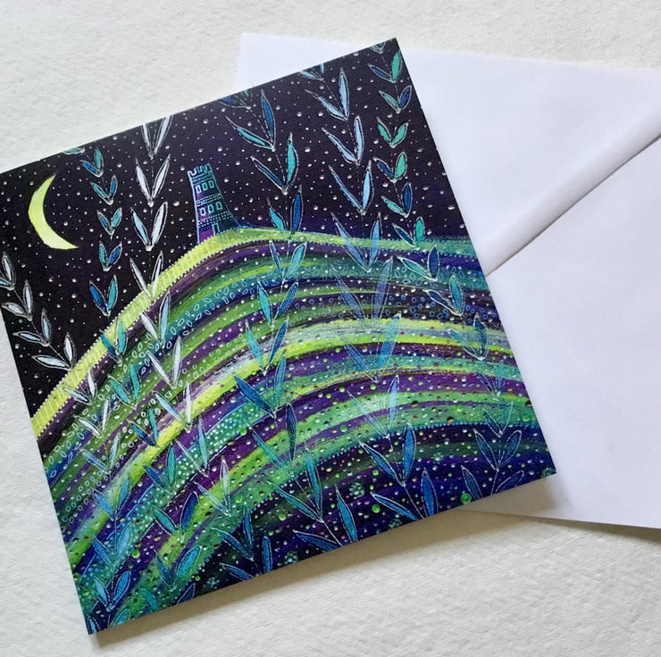 This card has been created from one of my original paintings. It features a imagined landscape based loosely on Glastonbury Tor. The card measures 14.5x14.5cm and comes with an envelope.
