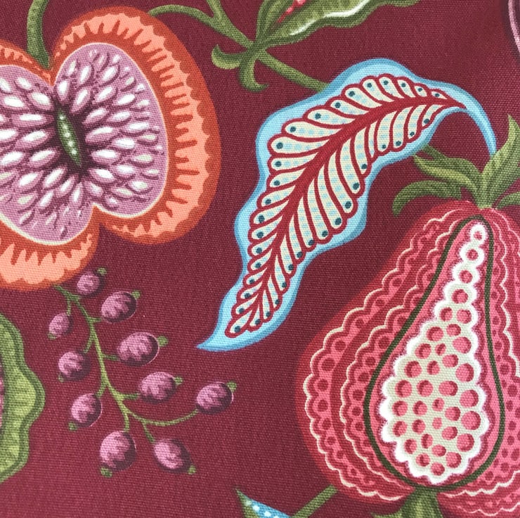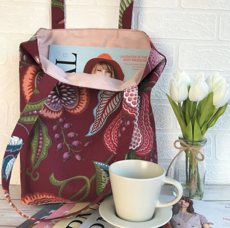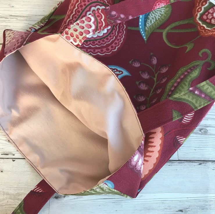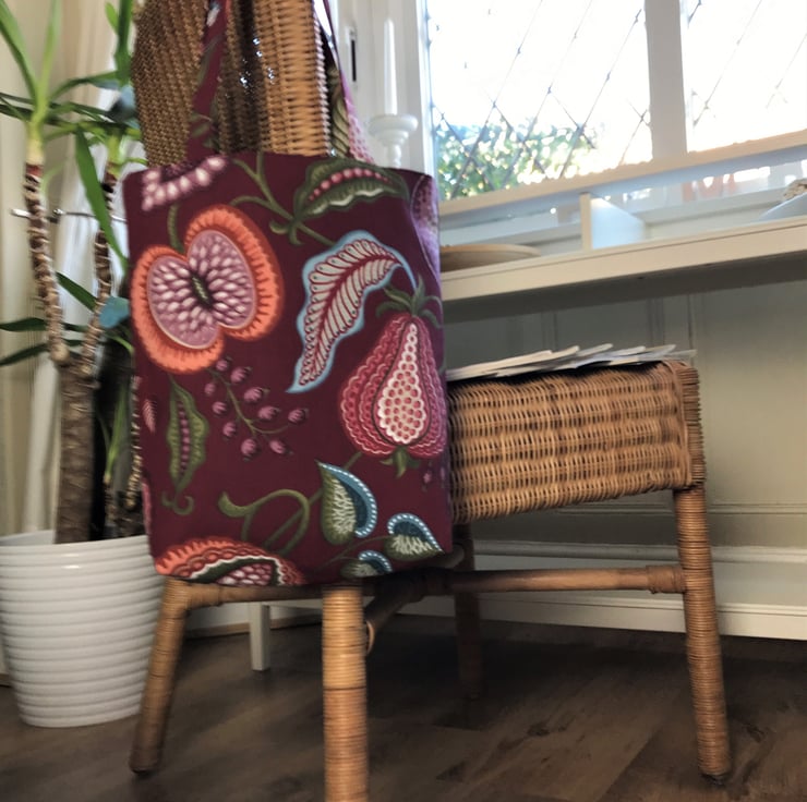 A bold and bright tote bag in a lovely print fabric featuring stylised fruit and foliage, including an apple and a pear, in shades of pink, terracotta, blue, green and purple on a rich burgundy background. The bag is lined with a pale dusky pink fabric which matches the pink accents in the outer fabric.