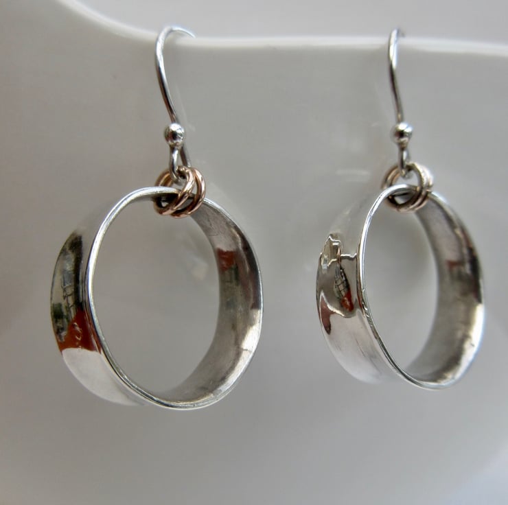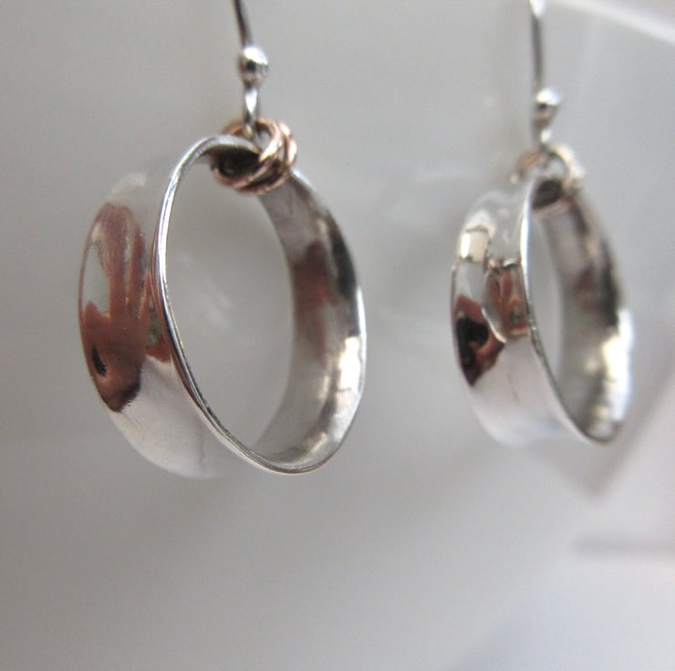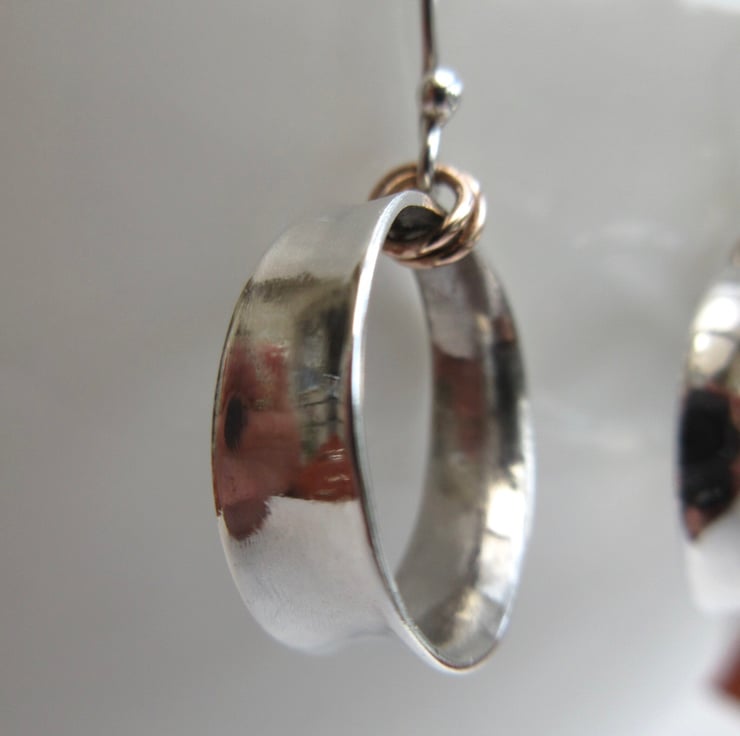 Wide graduated bands of sterling silver gently flare out at the edges, the added curves giving a touch of individuality, while the highly polished finish means they reflect the light beautifully. Two 9ct gold links add detail and a lovely finishing touch to earrings that are delicate yet eye-catching.