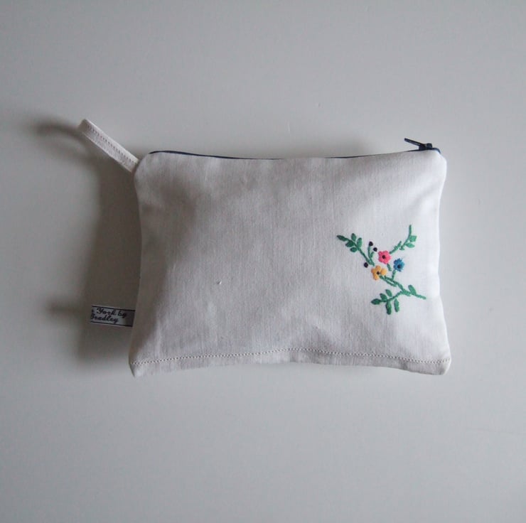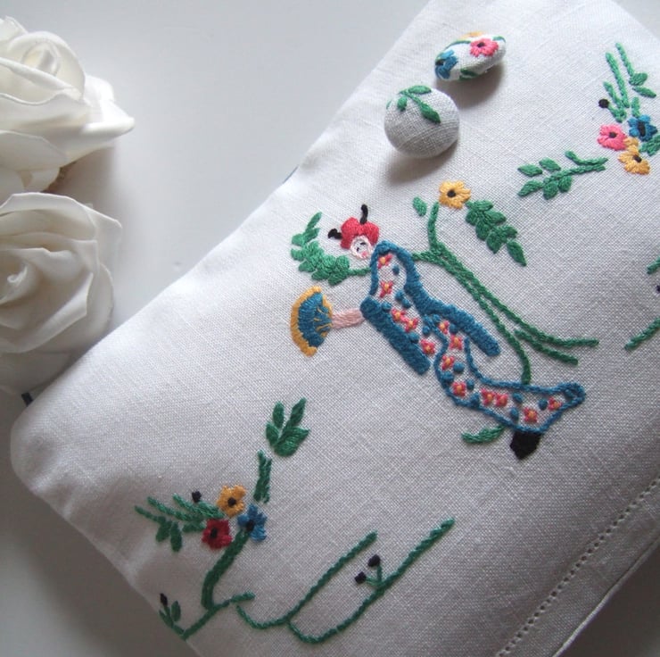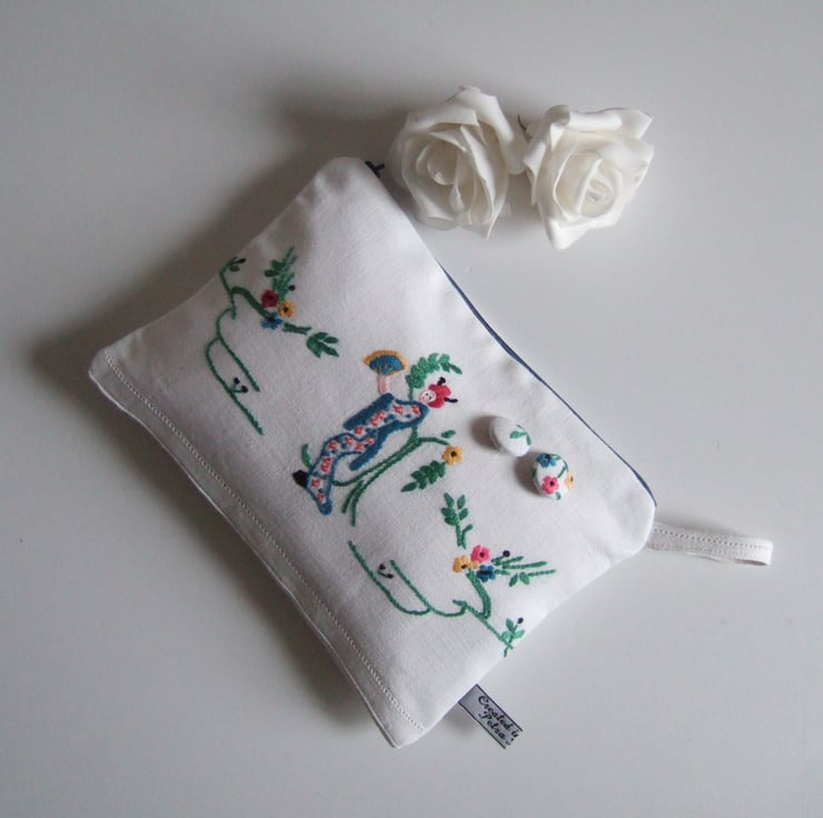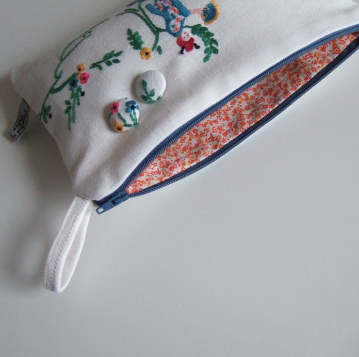This vintage embroidery traycloth of a Japanese lady with blossoms has made up into the sweetest little make up bag. It could also carry travel size toiletries or store special mementos.