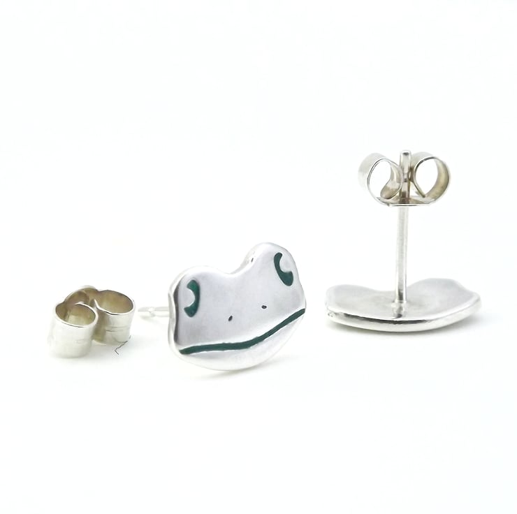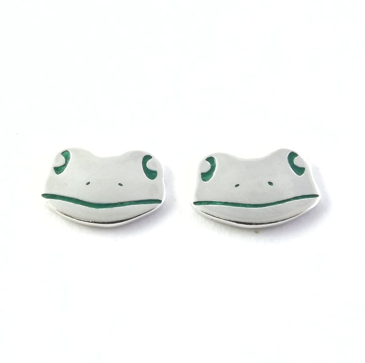These frog stud earrings are from my wildlife themed jewellery range and have been lovingly handcrafted in the UK. They are made from sterling silver sheet and are etched before being cut by hand, the edges are then smoothed using files and emery paper before the earrings are carefully given there shape using a punch and hammer. 11mm ear pins are then soldered onto the back. A green resin based enamel is added to the etched areas and the earrings are then polished.
