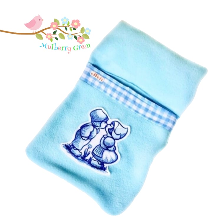 A sweet blue fleece sleeping bag made especially for the Mulberry Green characters. The sleeping bag is trimmed with blue and white gingham cotton and embroidered on the front with two little Dutch children. Perfect for a Mulberry Green Doll at bedtime.
