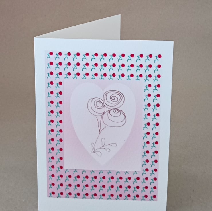 The artwork is a combination of scanned original handmade or hand embroidered artwork that I made, which I have digitally edited to create a handmade Heart card design with a background of lots of red roses that were hand drawn then scanned, surrounding a central cream heart in which there is a bunch of black roses which is a scan of an embroidery design.