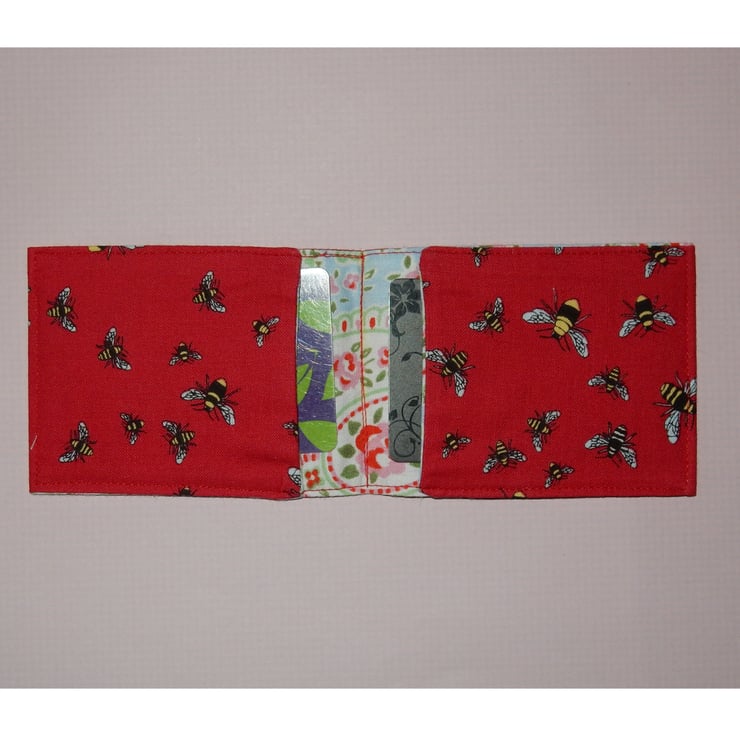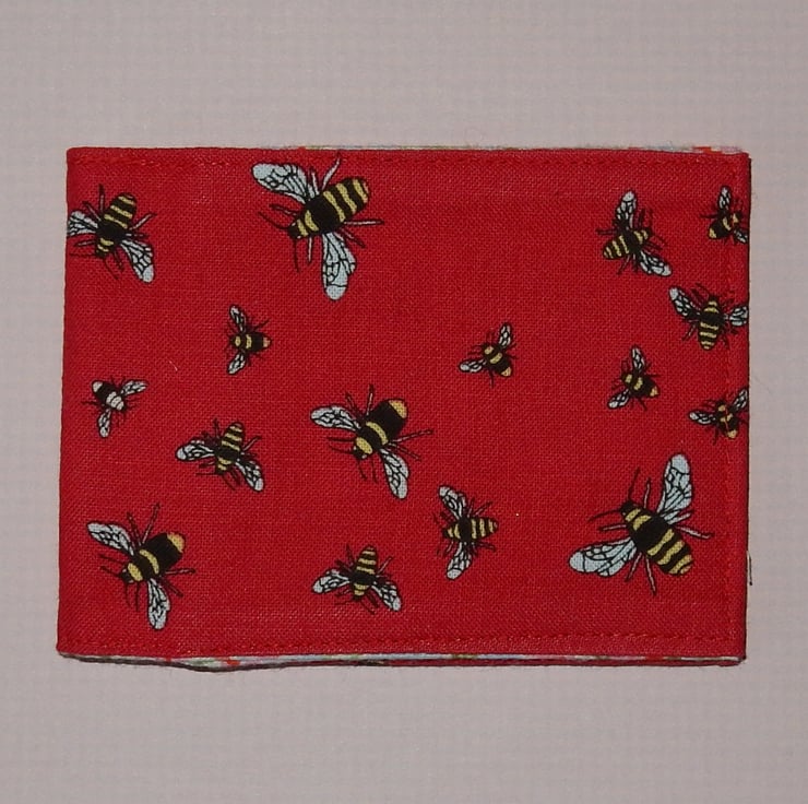A useful gift for lovers of bees, a fun hand made wallet, ideal for travel cards, Oyster cards, bus pass or even credit cards. It measures approx. 3.5 x 3 inches folded and 7.5 inches open. It is made from cotton fabric, featuring bees, it is lined in toning fabric.