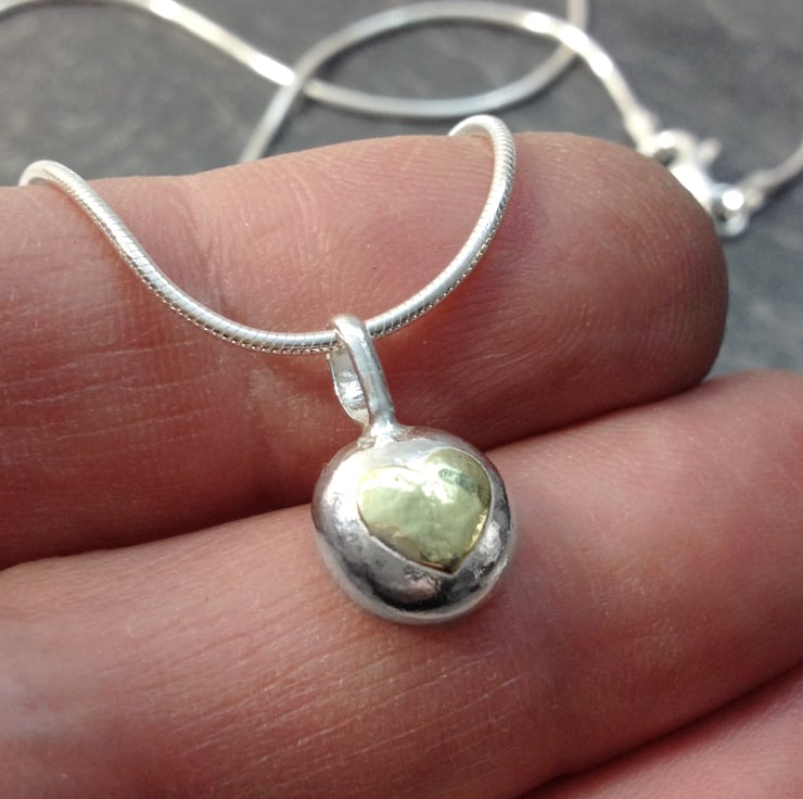 Solid thick sterling silver pebble with gold heart detail. The pendant has a beaten texture and has been polished to a subtle shine.