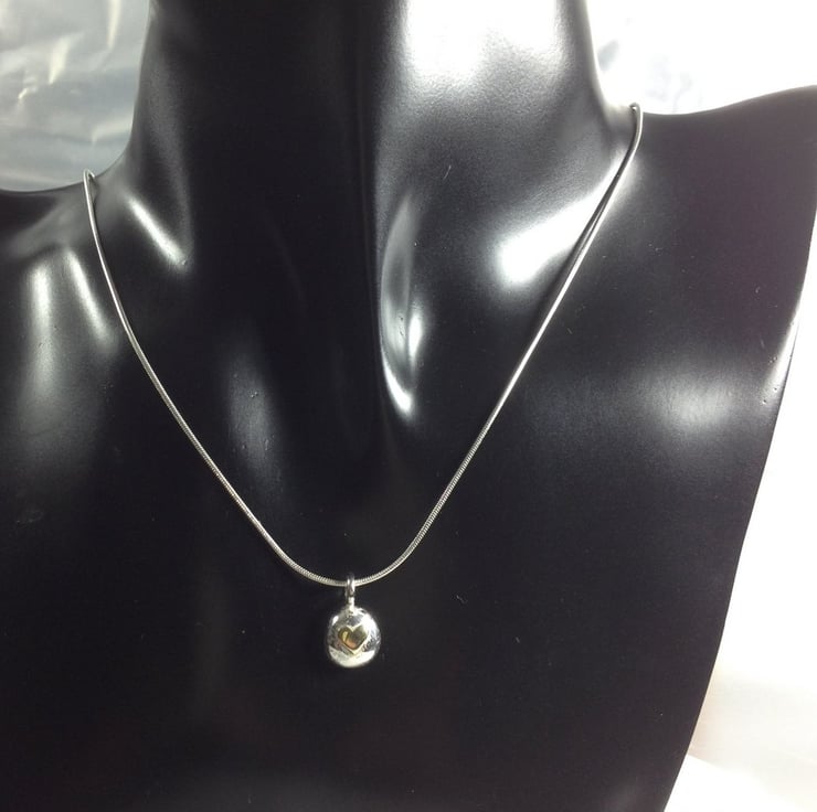 This mixed metal pendant has a lovely weight , it hangs from an 18" sterling snake chain. The pendant is approx 1cm in diameter and has been hallmarked on the back .