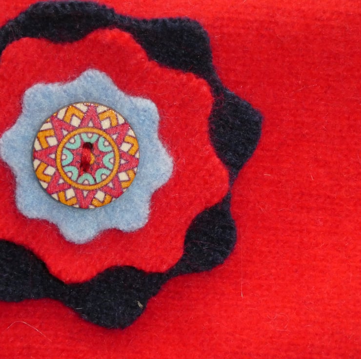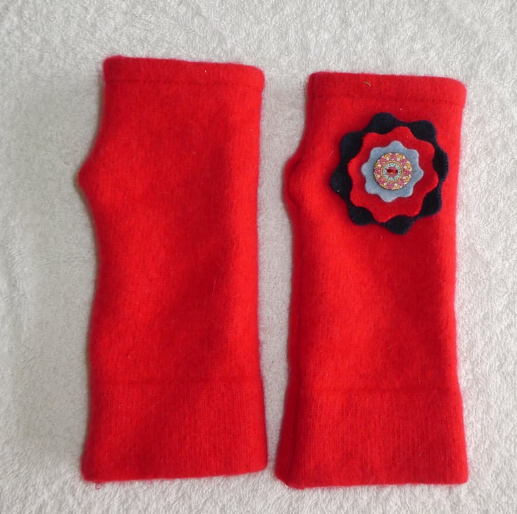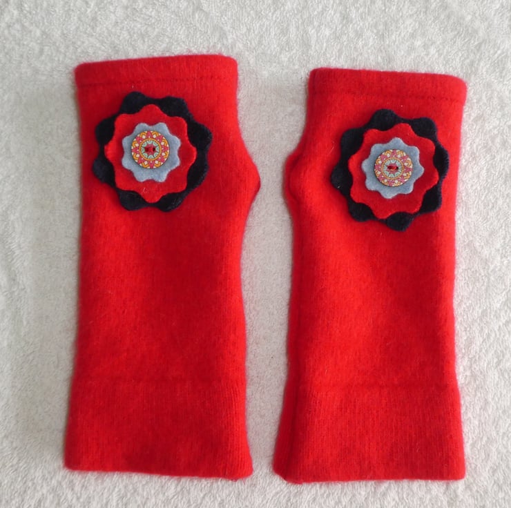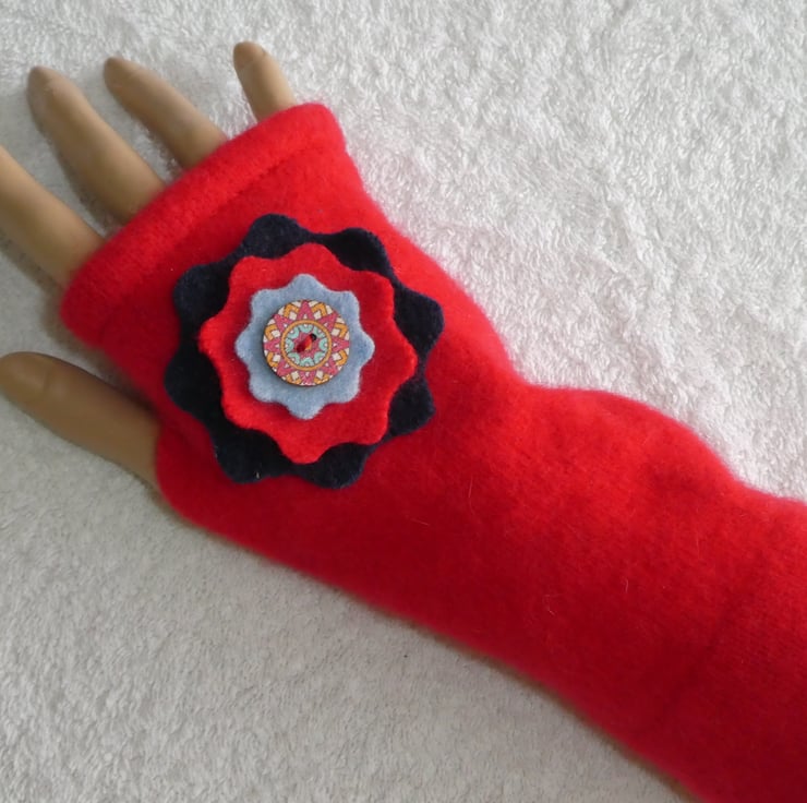 I have created these unique up-cycled arm-warmers from a lambswool and angora jumper. The jumper has been hot washed and felted before cutting and stitching into warm, soft and cosy fingerless gloves / arm-warmers, with a thumb hole. An upcycled felt flower with a wooden button has been stitched onto the back of the hand of the gloves for decoration.