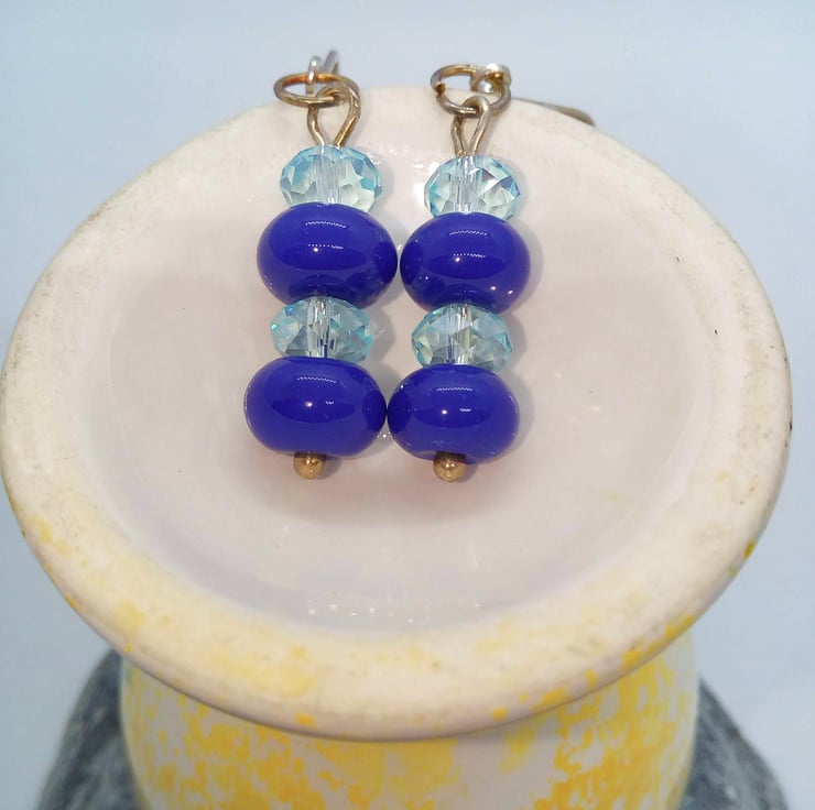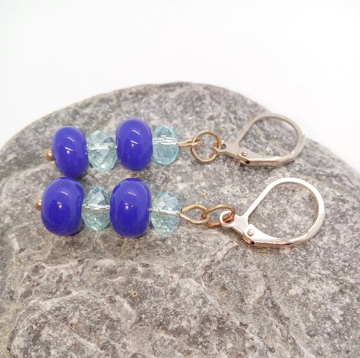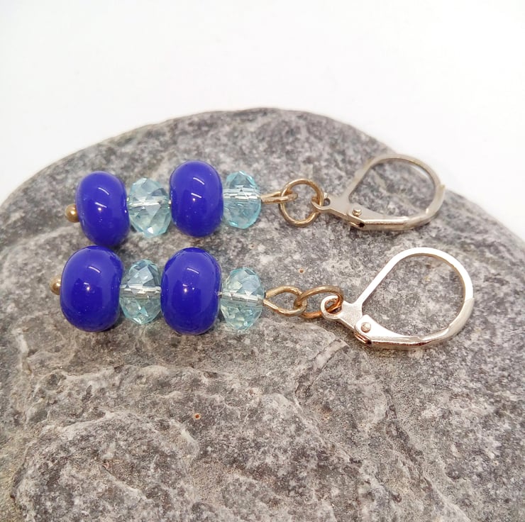 The earrings are made using two 8 mm x 6 mm heart shaped cobalt blue glass rondelle beads and two 6 mm pale blue crystal beads. They are suspended on silver plated ear lever backs and they have a drop of 2.5 cm.