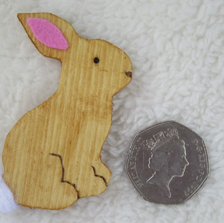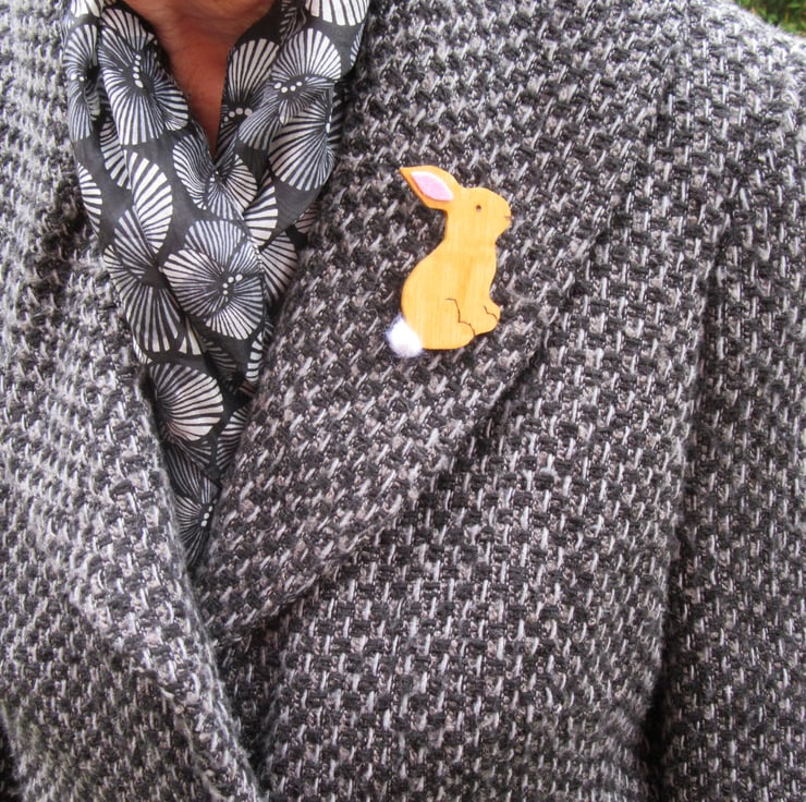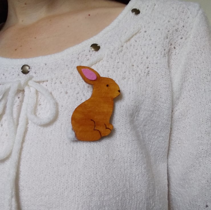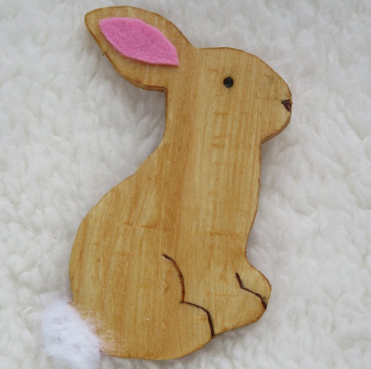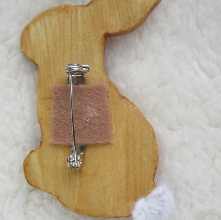 The finer details have been burned into the wood. The brooch is varnished with a satin antique pine coloured varnish to add colour and warmth. I have added a pink felt ear and a fluffy white wool tail, which brings character to this cute rabbit gift.