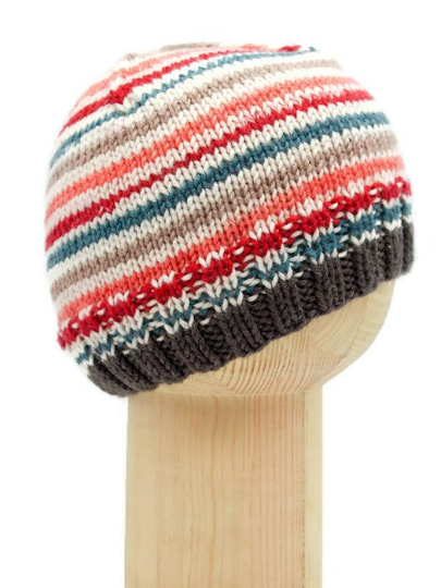 Hand knitted with lovely and soft cream, teal, orange, red and brown striped 100% wool.