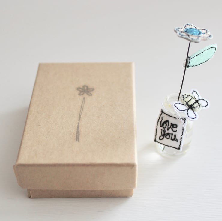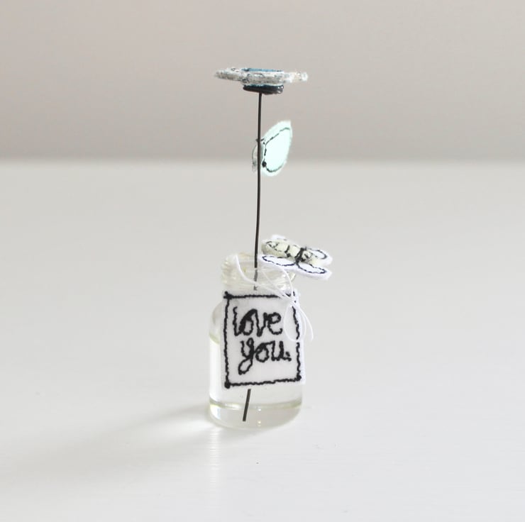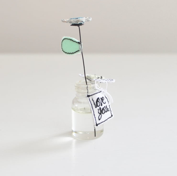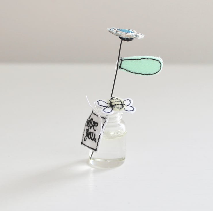The flower and leaf are created using fabric and free hand machine embroidery with a wire stem holding them in position in acrylic water. Sitting next to the flower is a fabric bee and around the bottle neck hangs a sewn fabric label saying 'love you'.