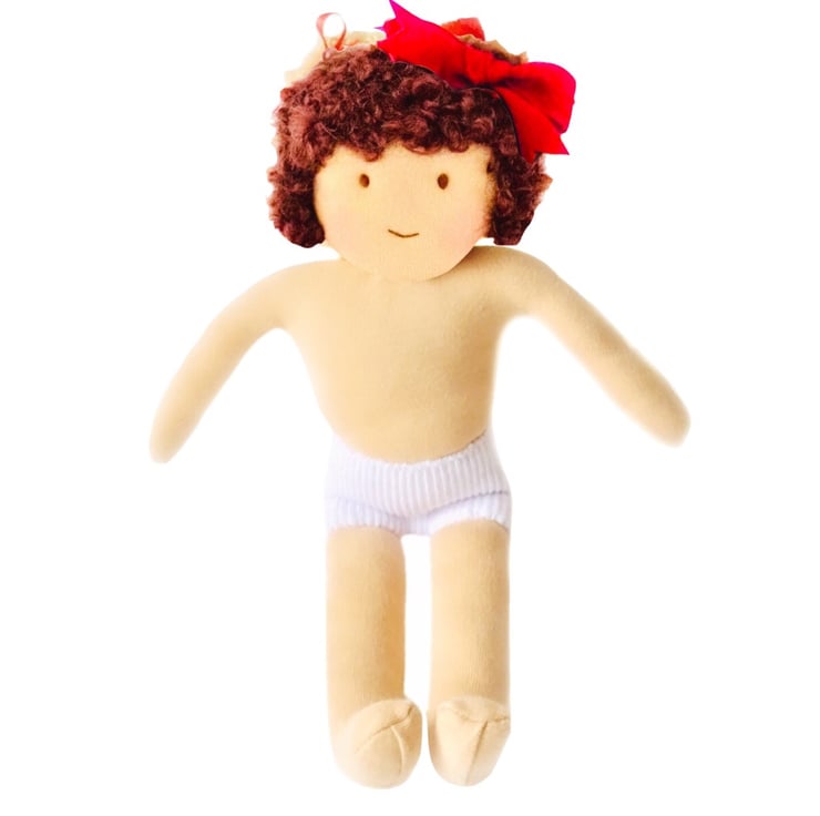 Ruby is a cute little doll made from best quality CE safe de Witte doll skin from Holland. She is made using a technique very similar to the Waldorf method, is very soft and squeezable and sits down easily. Her hair is made from pure wild mohair and her cheeks are coloured with beeswax. She is 28cm tall and is CE safe but is not suitable for children under 3.