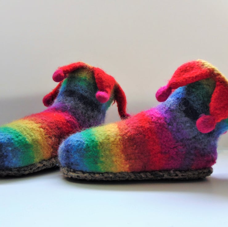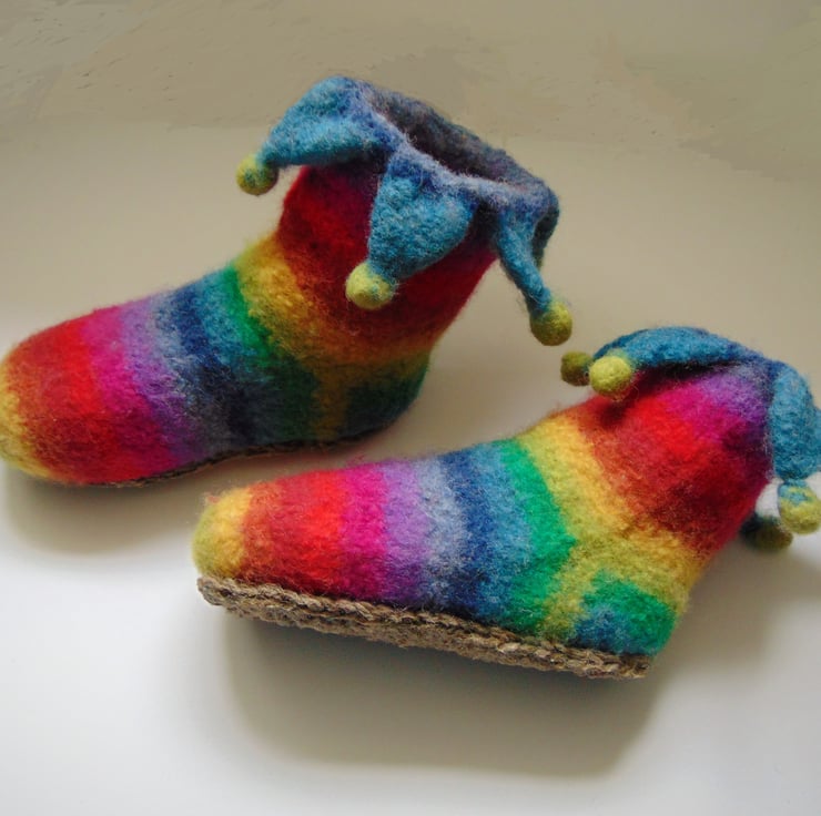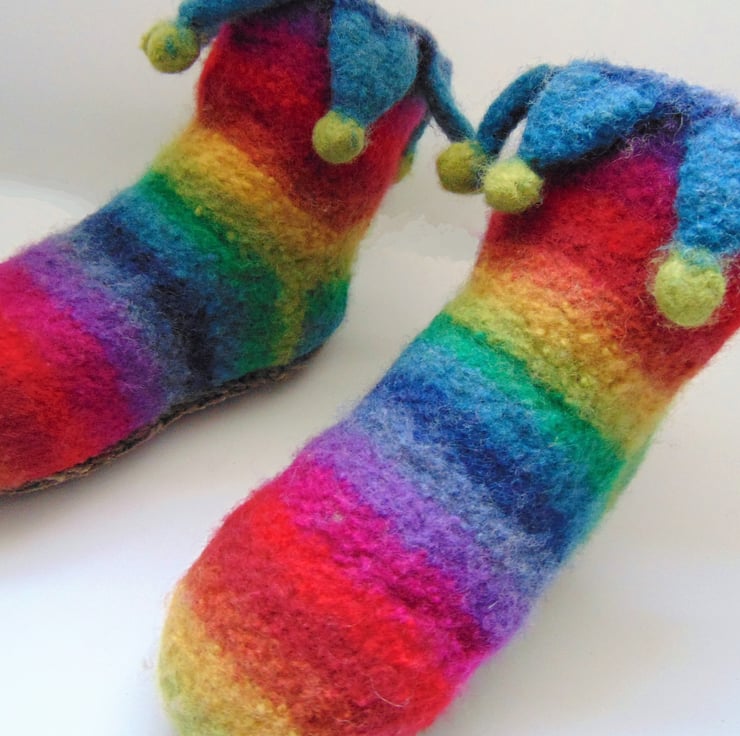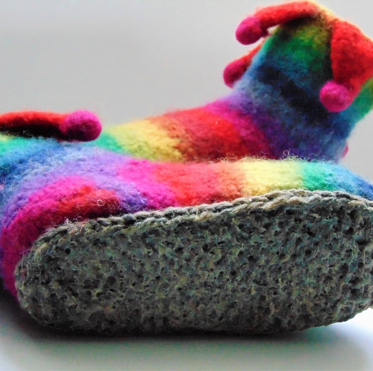 They are initially knitted then felted to create soft, sturdy felt fabric, which maintains it bright rainbow colour . Then the handmade wool soles are attached and sewn in place, the wool soles are given a couple of coats of natural latex rubber to prevent slipping.