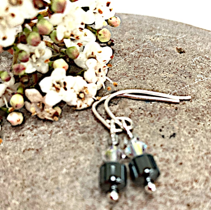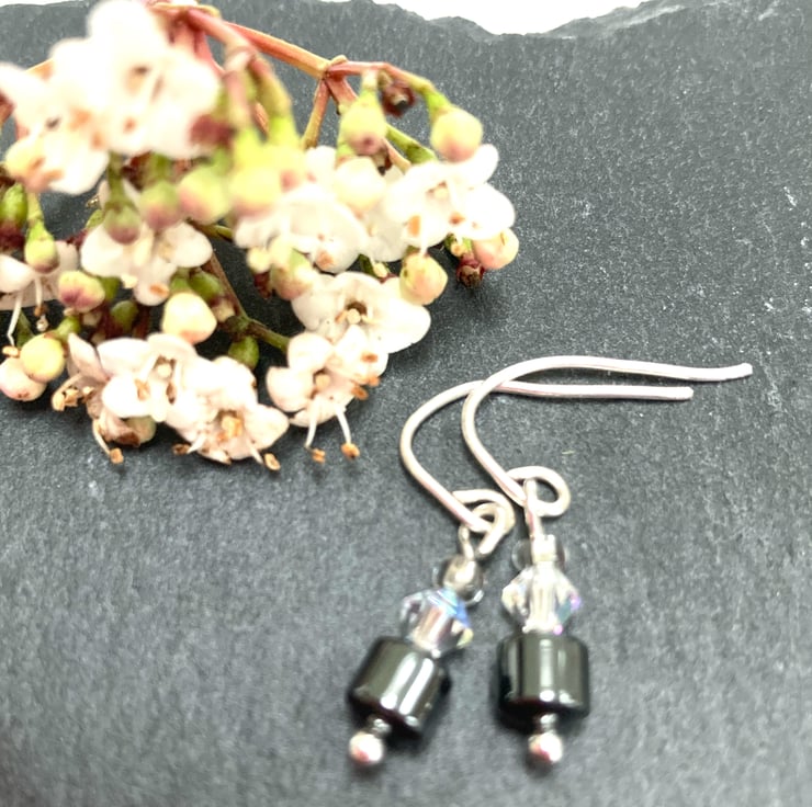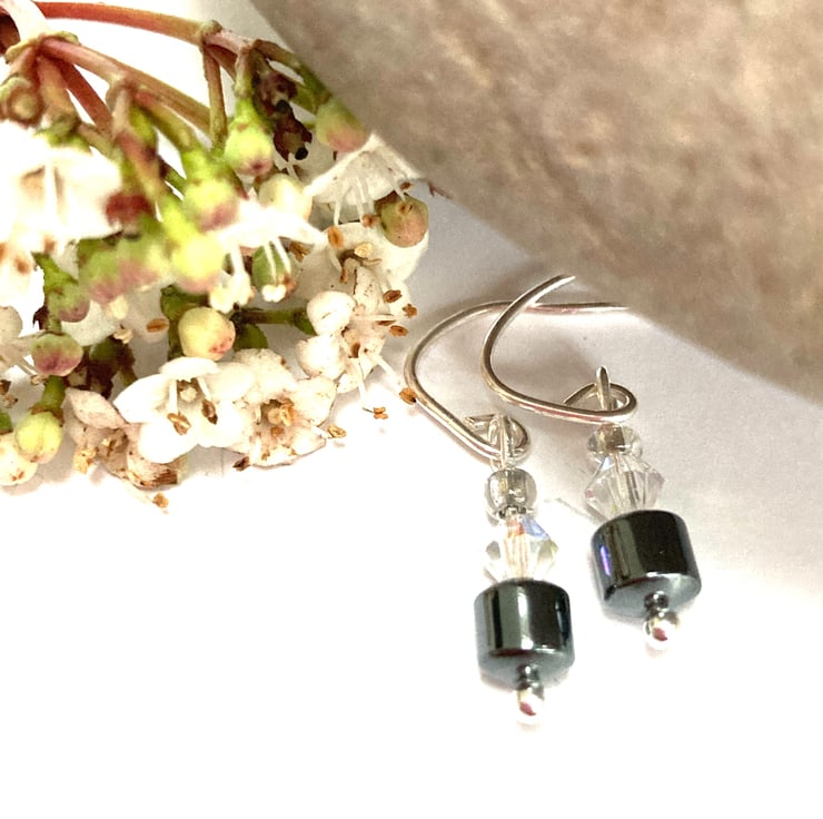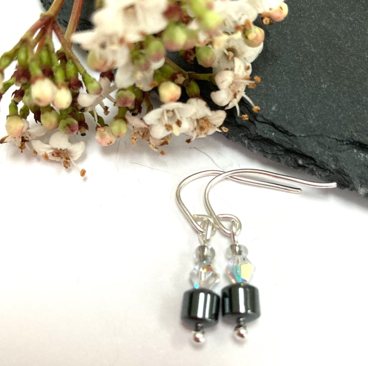 These pretty earrings are made from hematite beads and crystals with hand crafted sterling sliver fittings. Perfect for any occasion. See my shop for matching bracelet.
