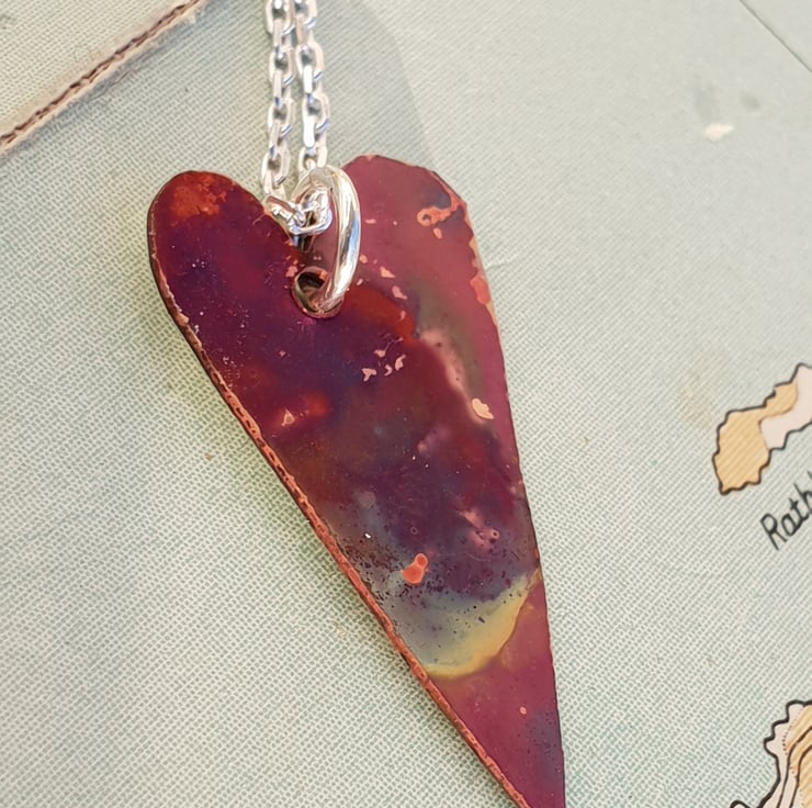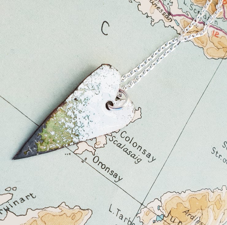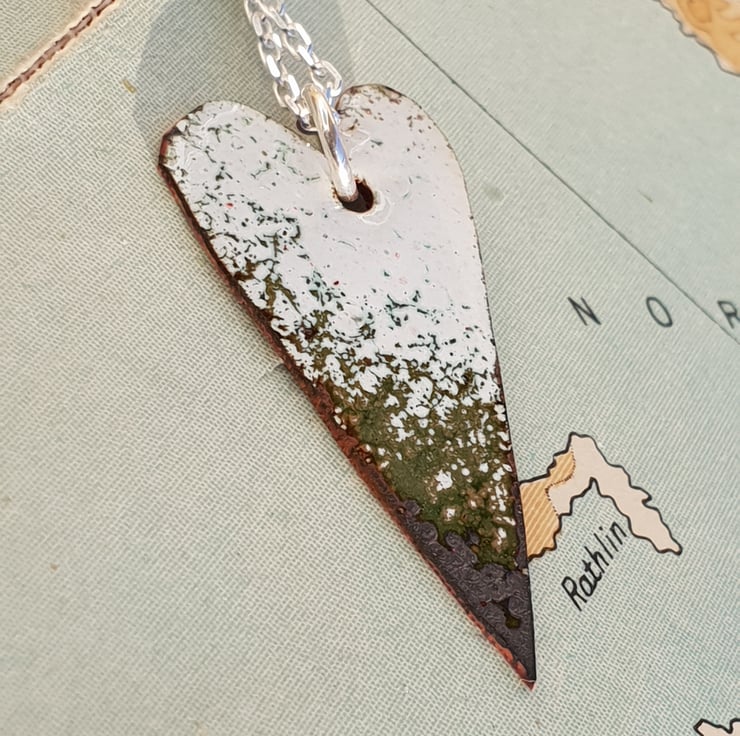Small Kiln fired heart with green and white enamel then raku fired, which produces the irresdesent sheen effect.
