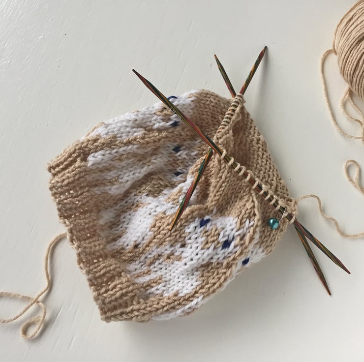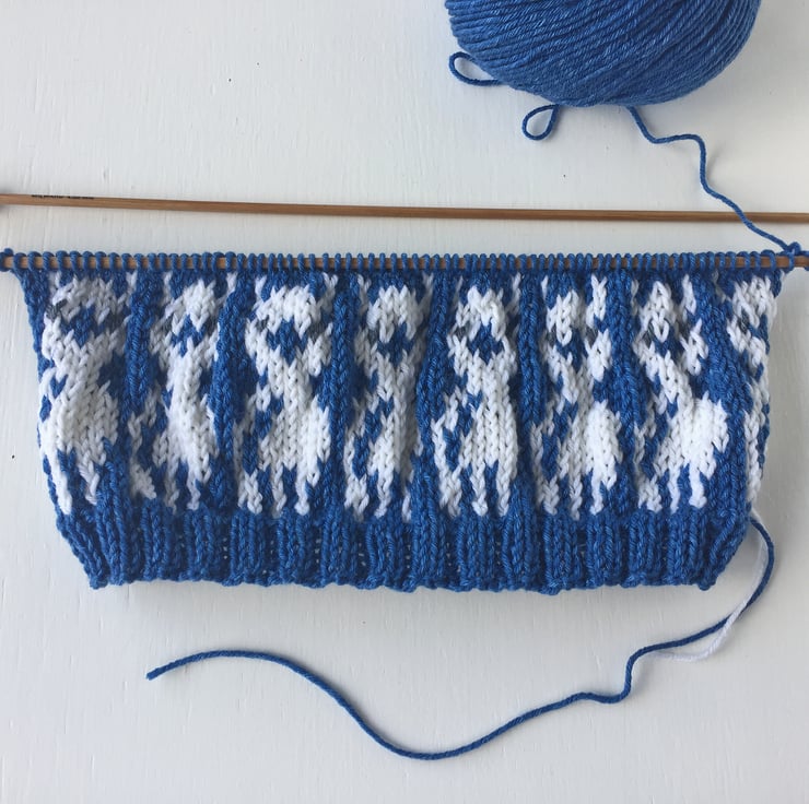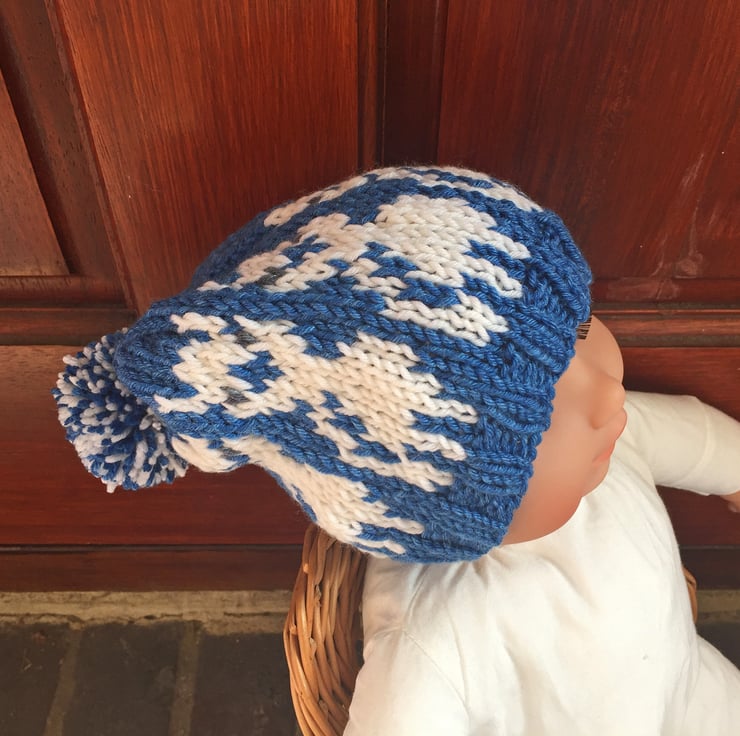 This hat has a ribbed welt and a stocking stitch body with the stranded colour-work alpaca repeat pattern encircling the lower section of the hat body. The hat pictured is worked using a lovely soft wool silk mix yarn in DK/light worsted weight, knitted on 4mm/US6 needles, and can be topped with a pompom.