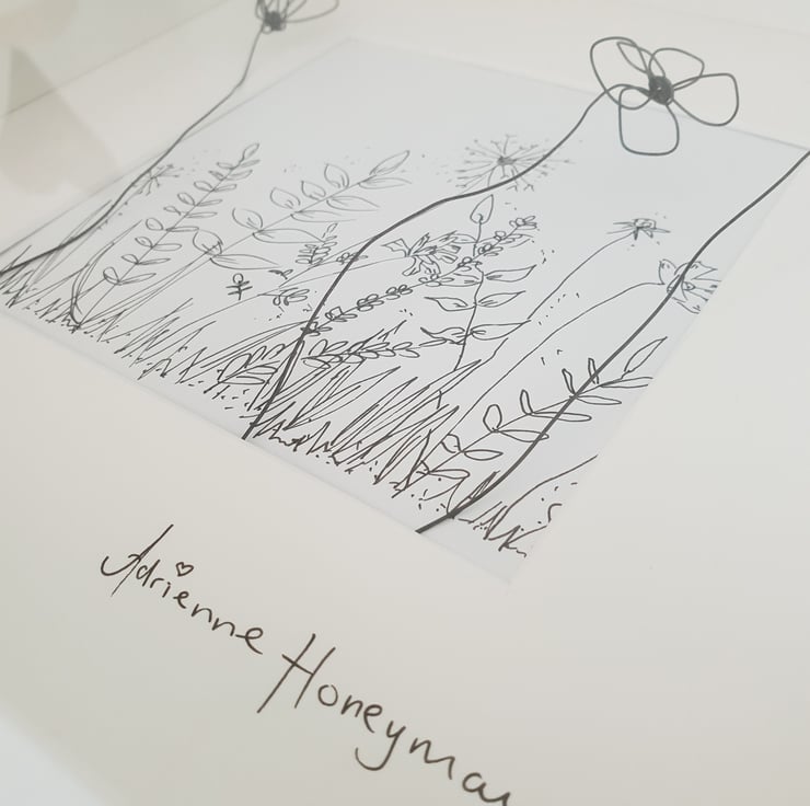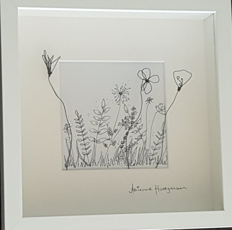 Pen and ink hand illustrated drawing of wild flowers and hand formed wire flowers are integrated to give it the 3D effect of an extension of the drawing.