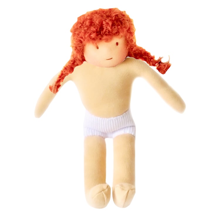 Marigold is a cute little doll made from best quality CE safe de Witte doll skin from Holland. She is made using a technique very similar to the Waldorf method, is very soft and squeezable and sits down easily. Her hair is made from pure wild mohair and her cheeks are coloured with beeswax. She is 28cm tall and is CE safe but is not suitable for children under 3.