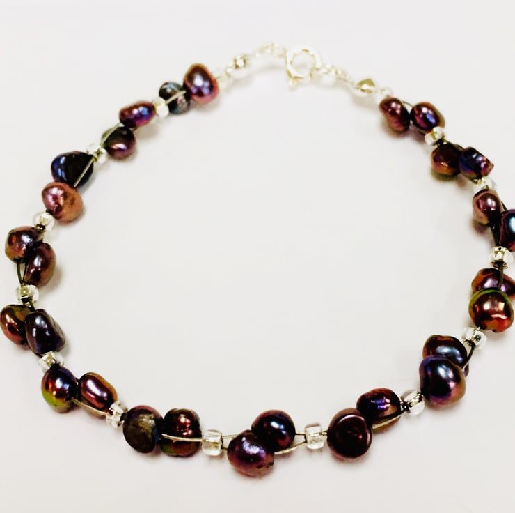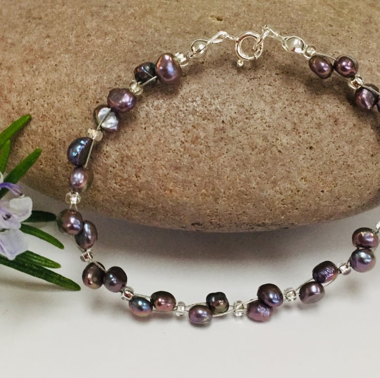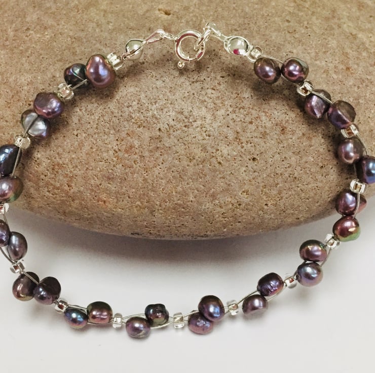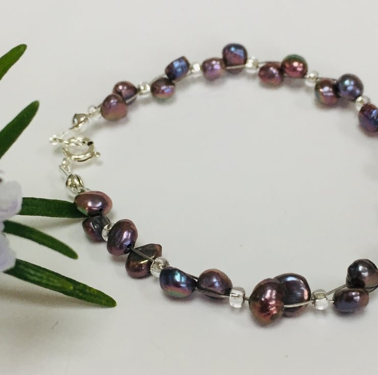 This pretty bracelet is made with iridescent freshwater pearls, interspersed with silver lined beads and finished with sterling silver fittings and a bolt ring clasp.