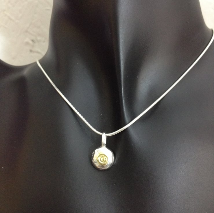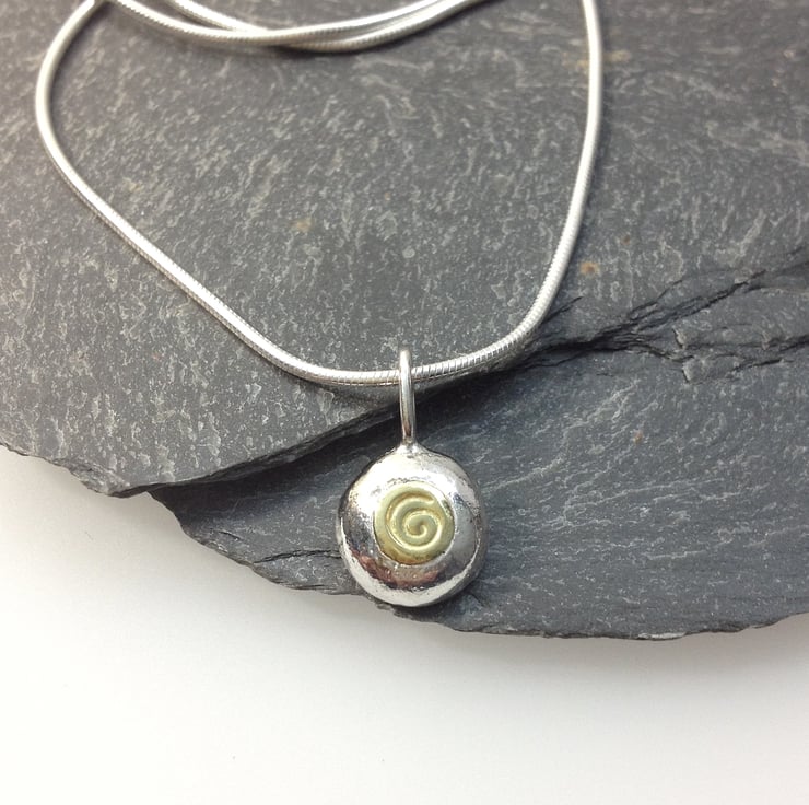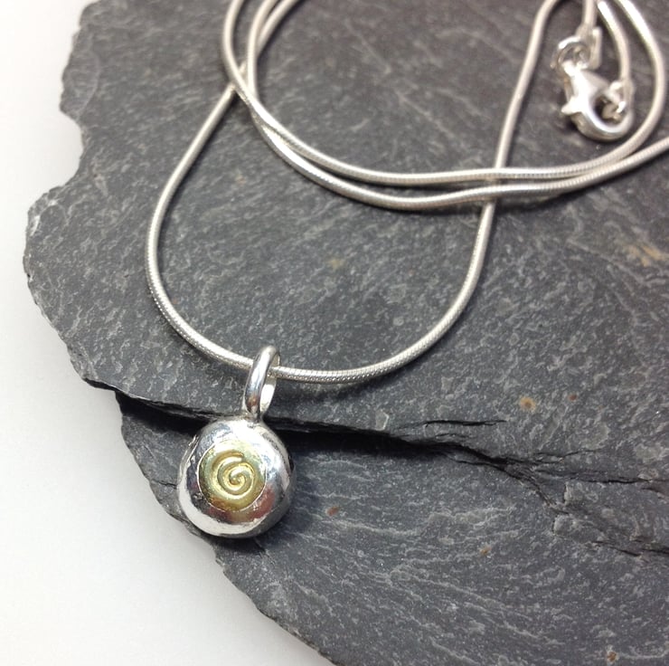 Solid thick sterling silver pebble with gold detail stamped with a spiral. The pendant is roughly a round shape , it has a beaten texture and has been polished to a subtle shine.