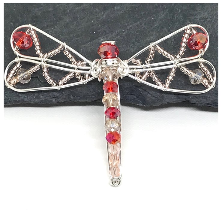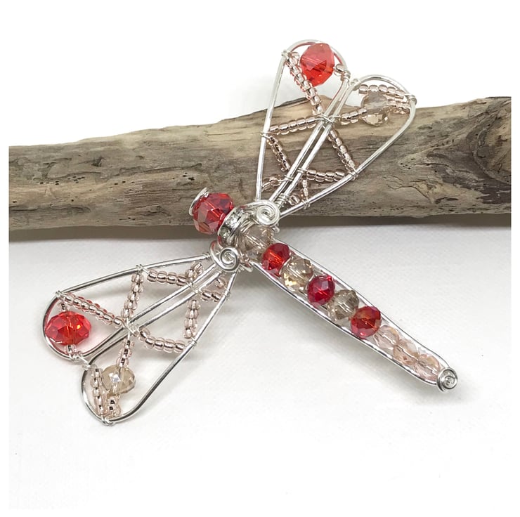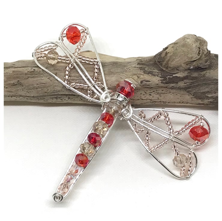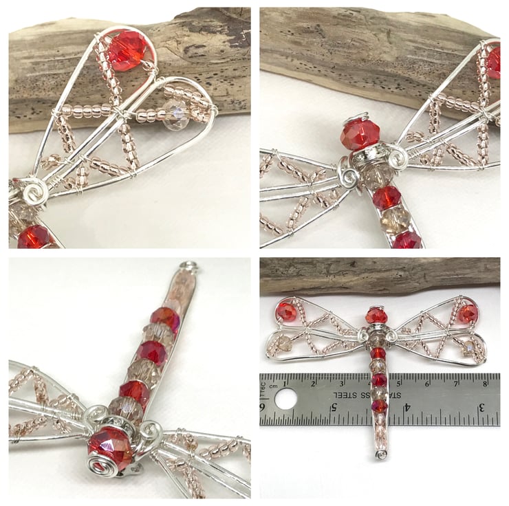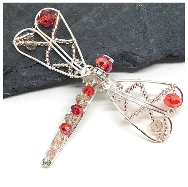 I have formed silver filled copper wire into a dragonfly shape. I have wrapped rosaline seed beads and beautiful bright orange and champagne coloured Czech crystal beads in a zig zag weave design across the wings. The body of the dragonfly has Czech crystal beads in beautiful bright orange and champagne crystals and a sparkling rhinestone spacer bead. The top and tail of the dragonfly are finished with a swirl of silver. The dragonfly body is attached to the wings and onto a silver coloured brooch back with safety clasp.