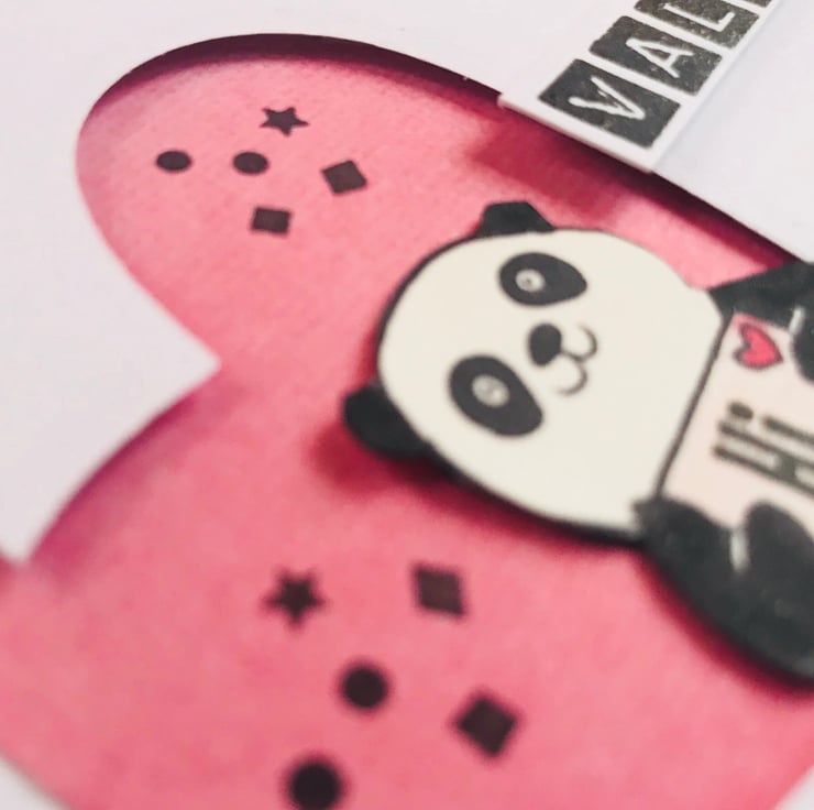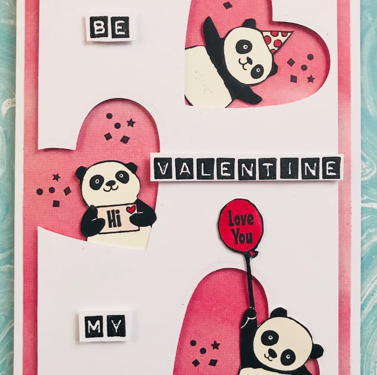 This is a cute handmade Valentine card ideal for those who love Pandas, especially the Partying kind! Each panda has been stamped and fussy-cut before being coloured using alcohol pens.