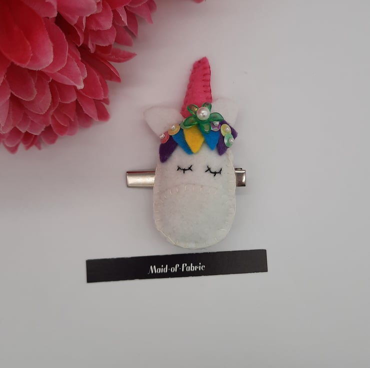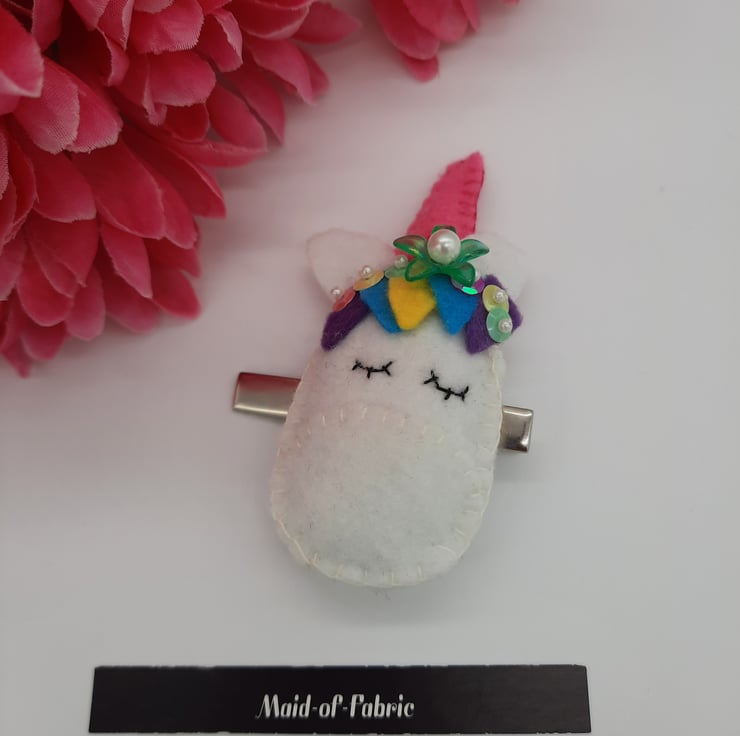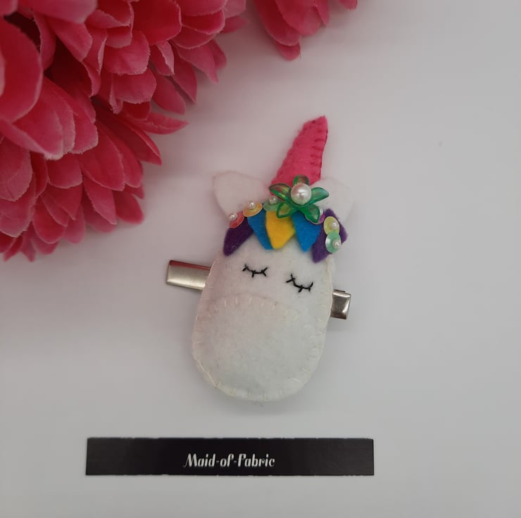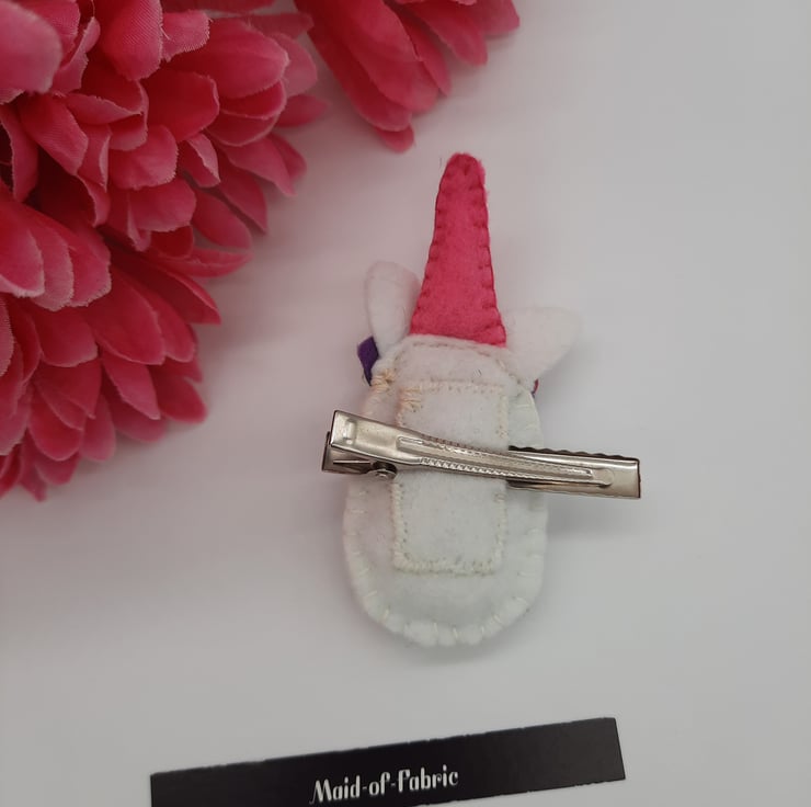 The unicorn measures 4" x 2" and is attached to a silver 2" hair slide clip.
