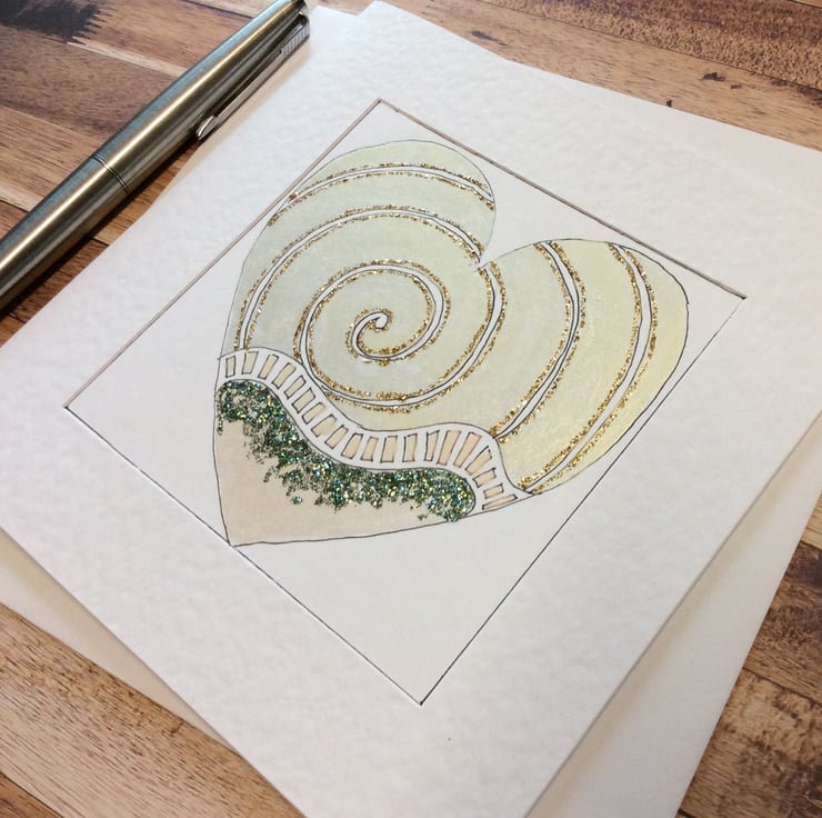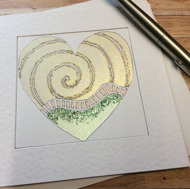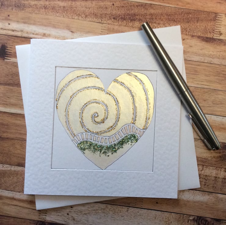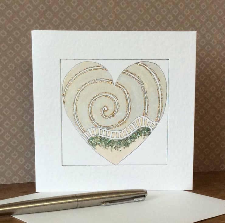 Iridescent unique and original hand painted card has a spiral on the top half with pattern and texture underneath set inside a plump heart. The colours change depending on the light. It is blank inside making it ideal for any occasion. The card is Hammer White measuring 14.5 x 14.5cm. The Art work measures 9.5 x 9.5cm and comes with an white envelop in a plastic cover for protection.