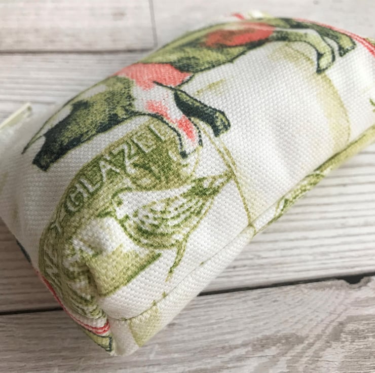A small coin purse with a lovely rustic farmyard print pattern featuring a sage green and pink pig. The quirky background pattern shows a little bird and a recipe in sage green script on a cream background. The coin purse has a cream zip and is lined with cream fabric. The base of the purse is boxed to give a spacious interior.